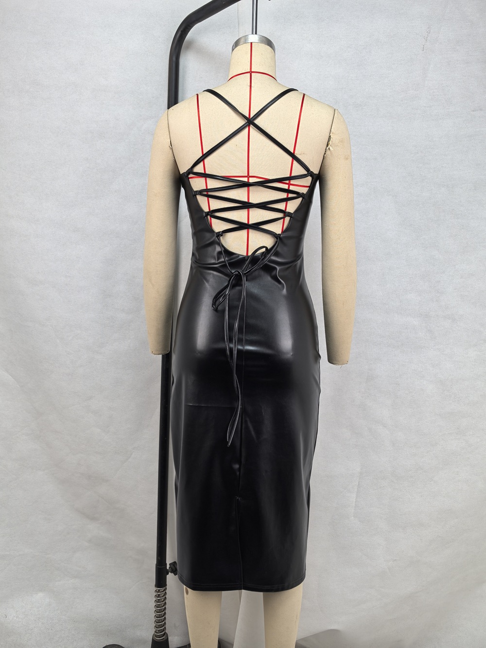 Vestido sin mangas dividido de piel sintética para discoteca, sexy, sin espalda, con cordones