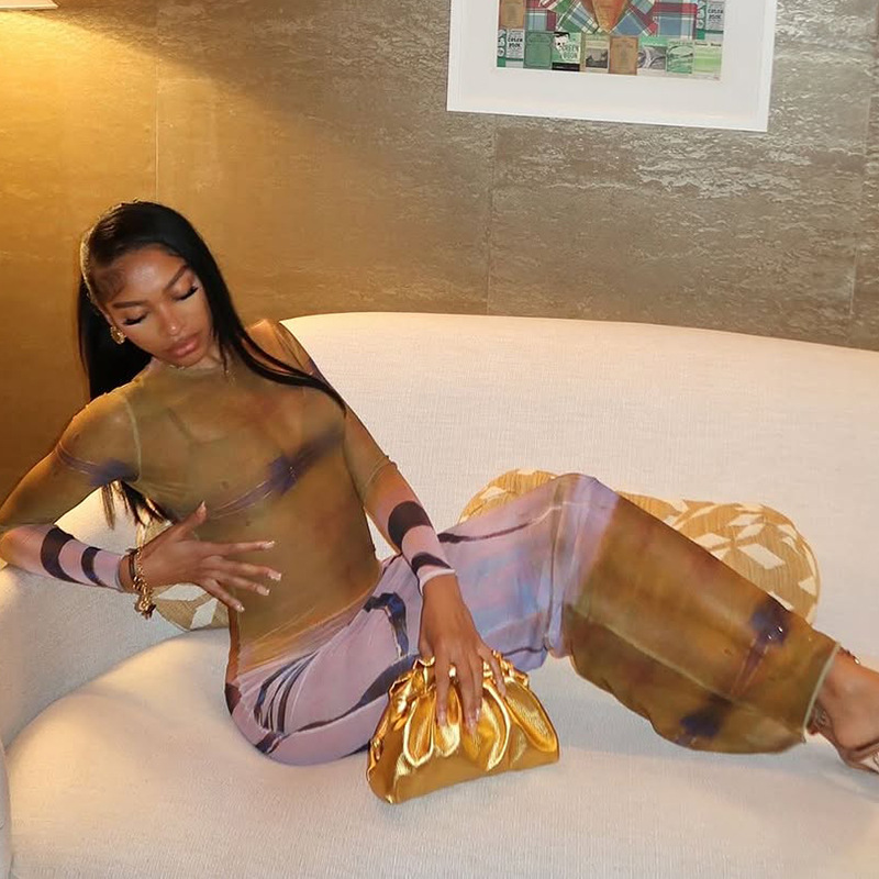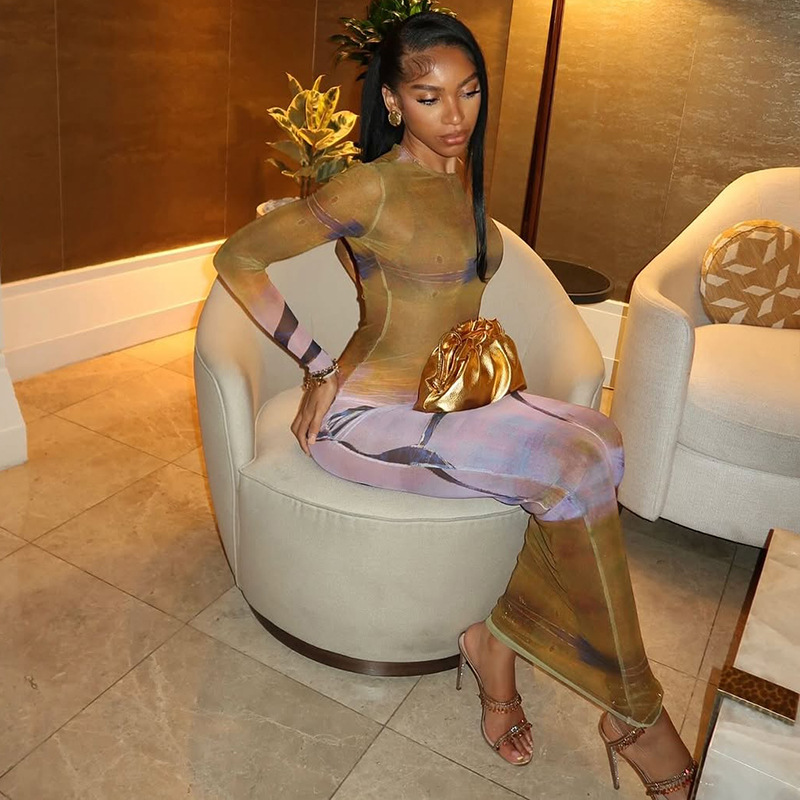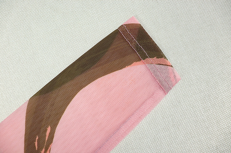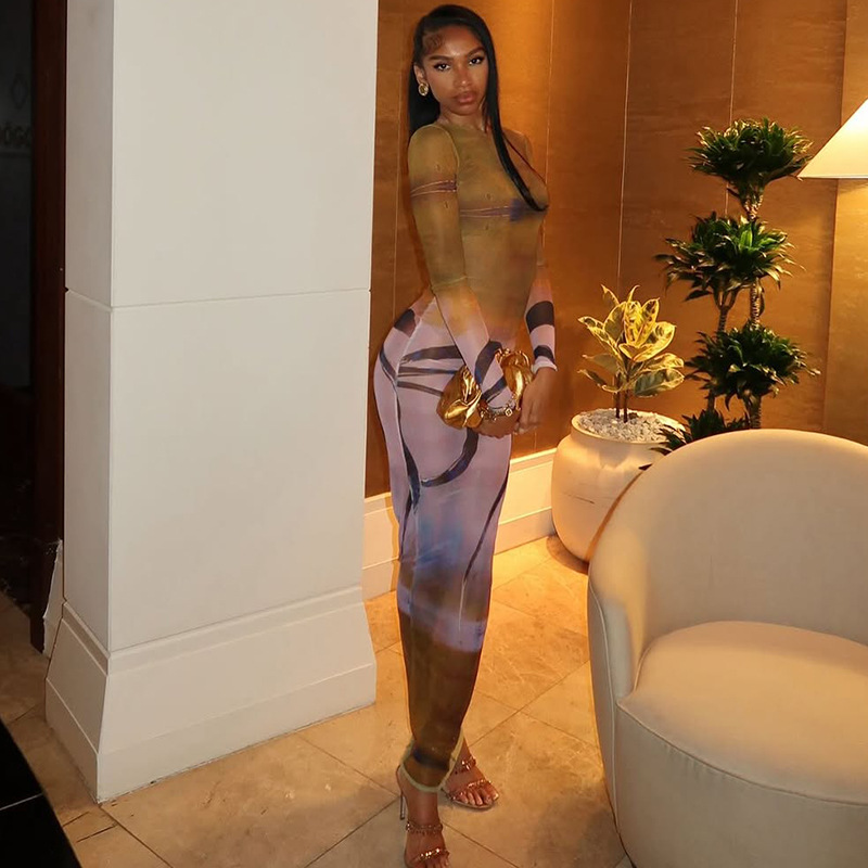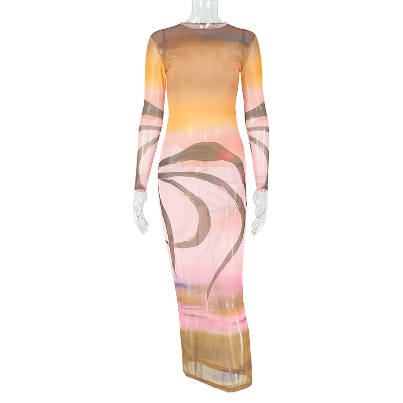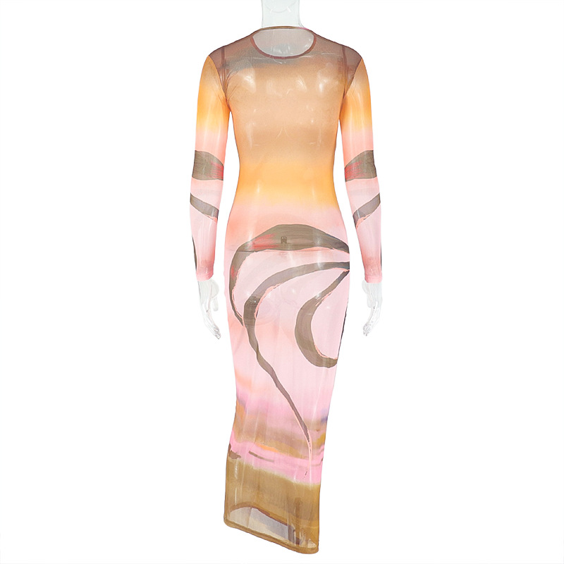 Vestido ajustado para mujer, con costuras, estampado retro a la cadera, cuello alto, manga larga, ligeramente transparente