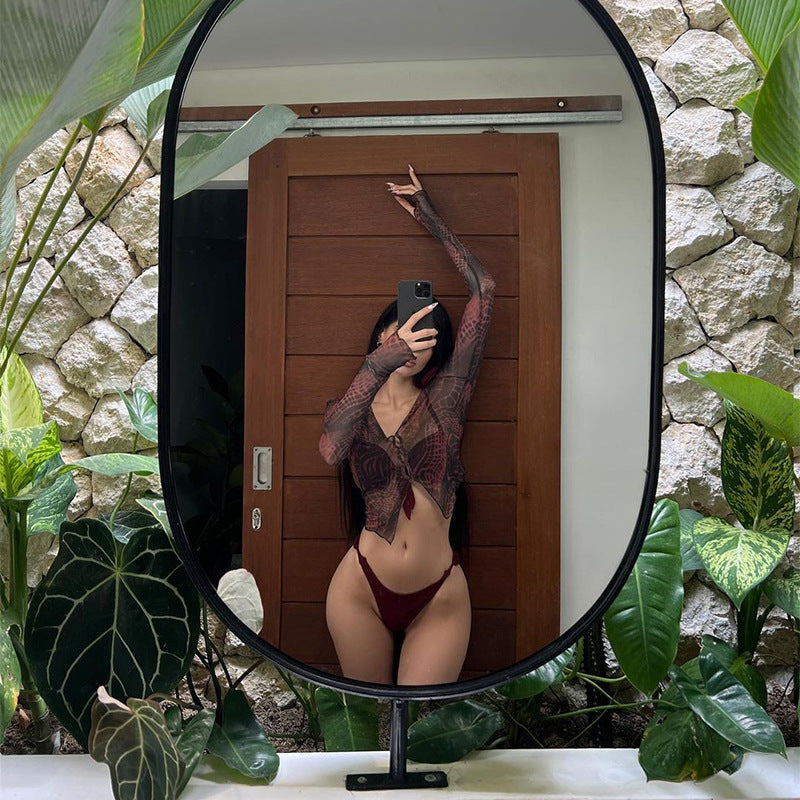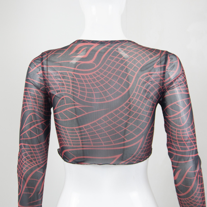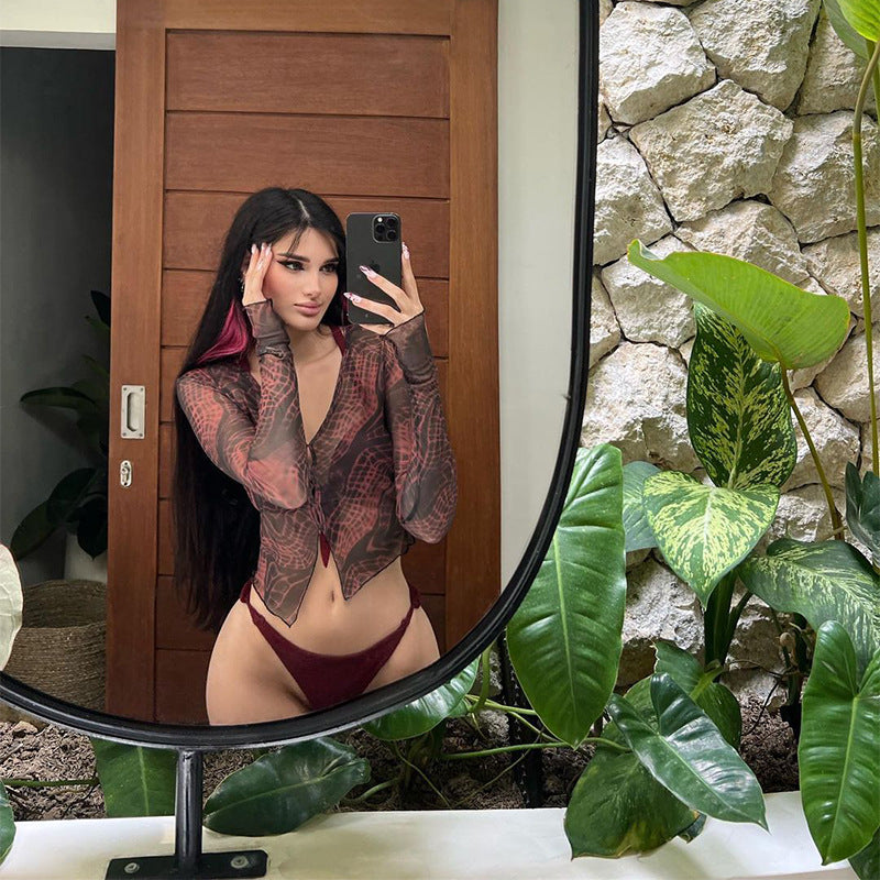 Top corto de manga larga transparente con estampado floral de malla y protección solar para playa de verano con orejas de madera y dedo