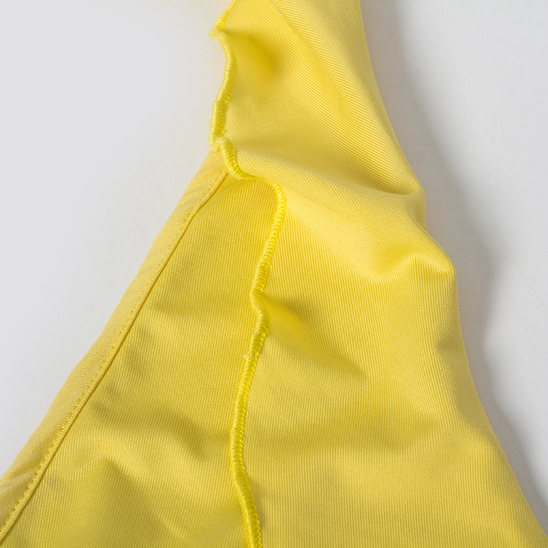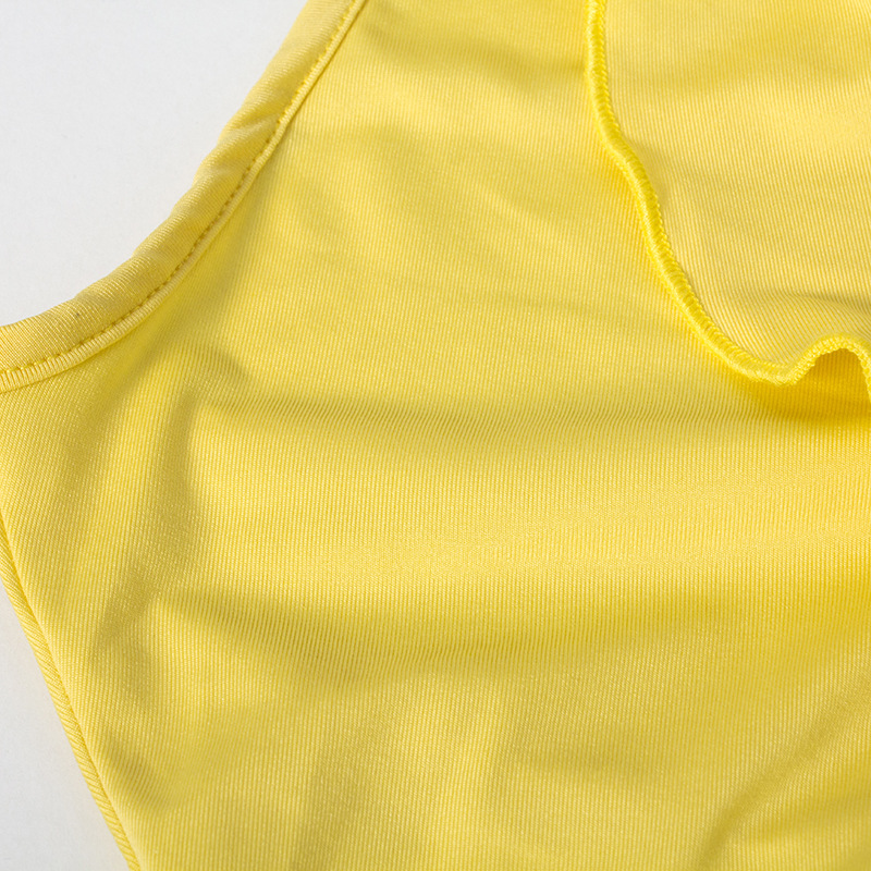 Vestido corto de verano de color liso sin mangas con cuello bajo y orejas de madera, asimétrico e irregular, cruzado en la cadera