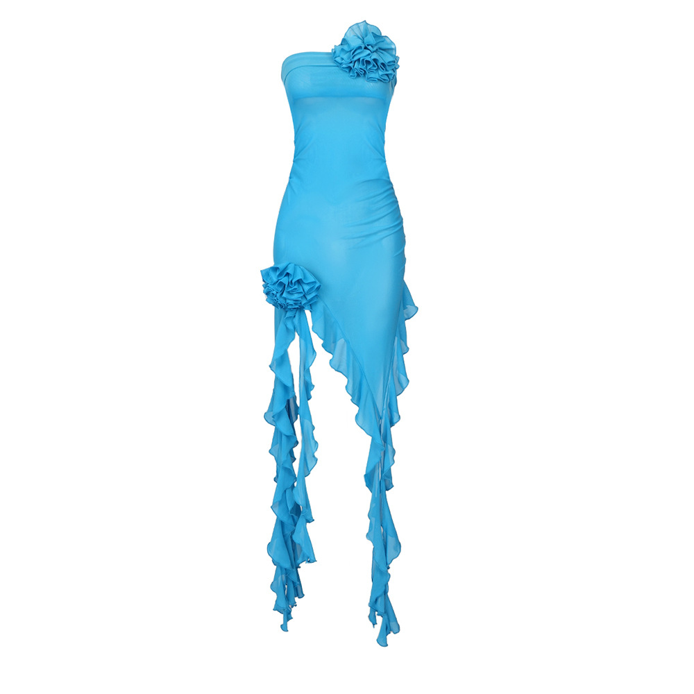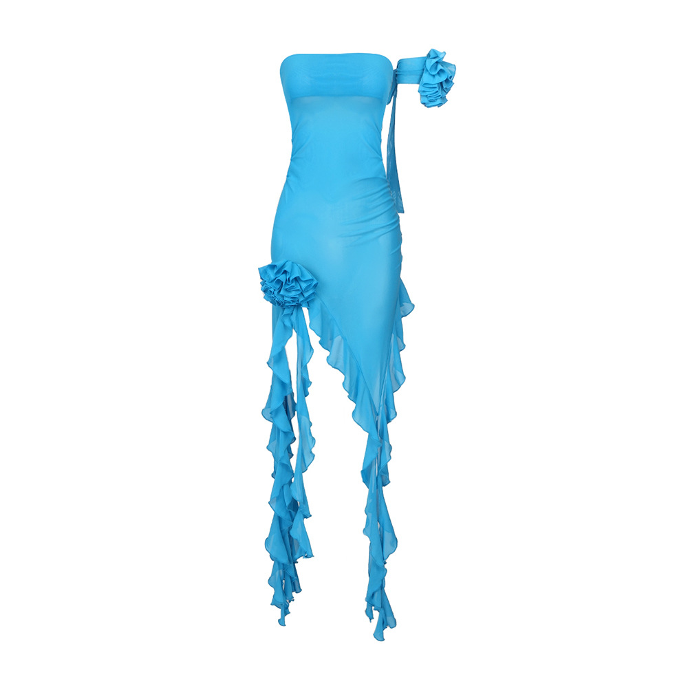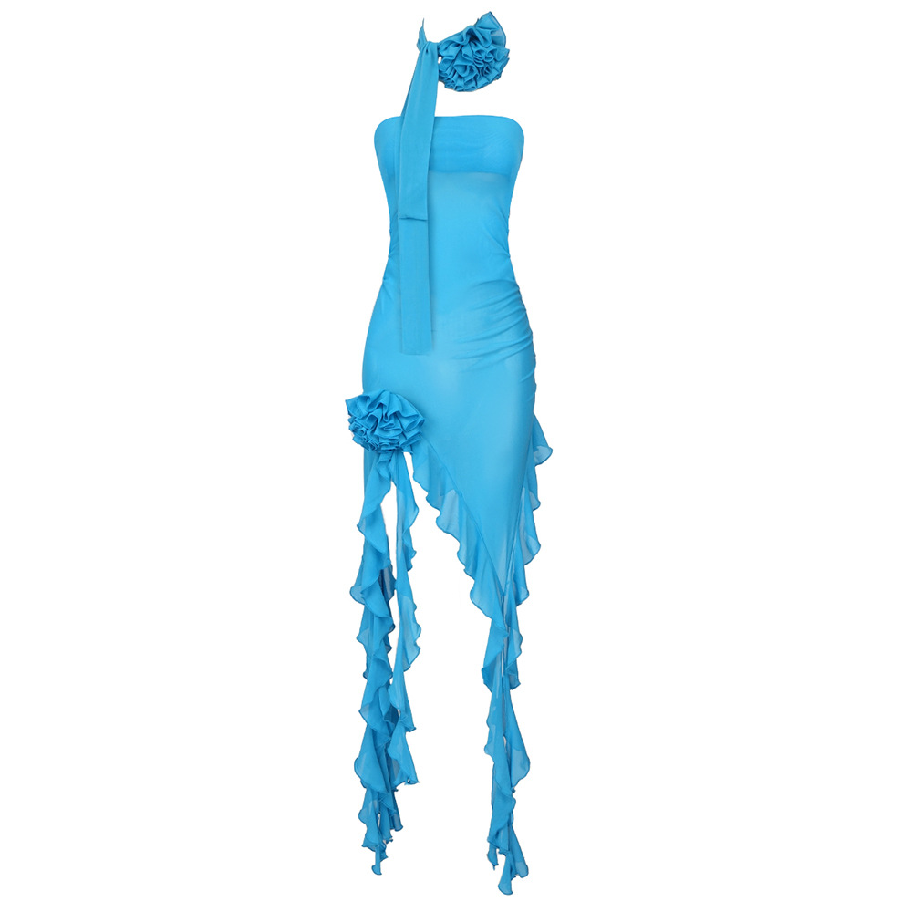 Vestido de verano para mujer, de gasa azul, sin tirantes, con cinta floral y hilo de red blanco