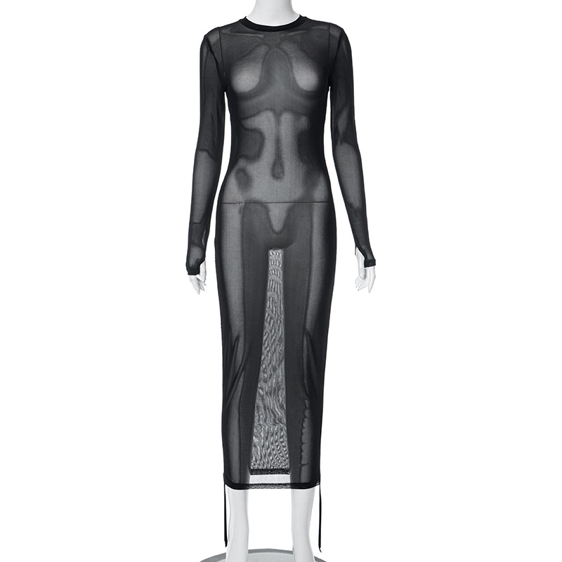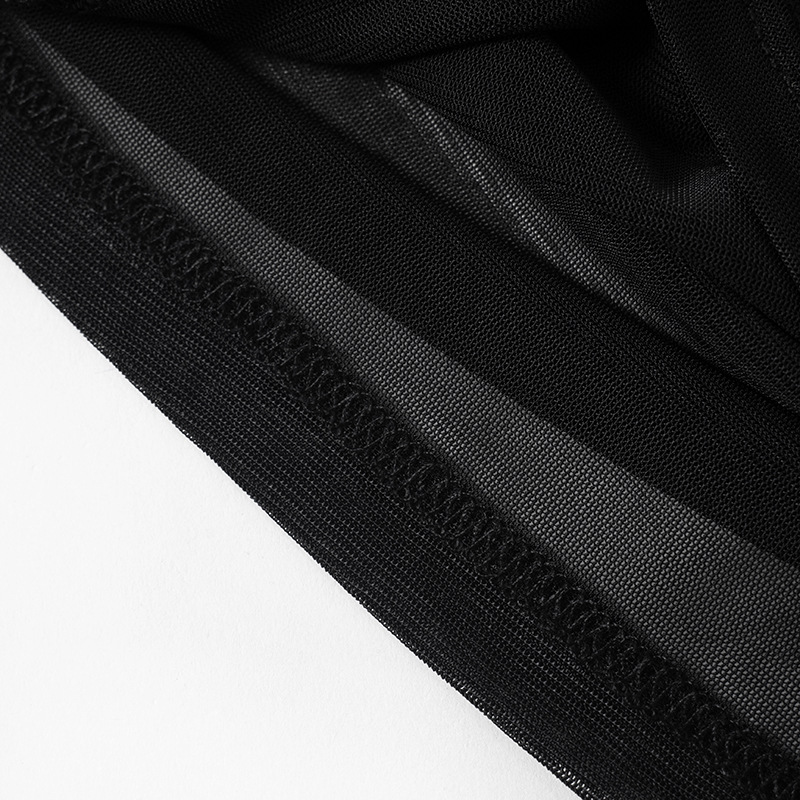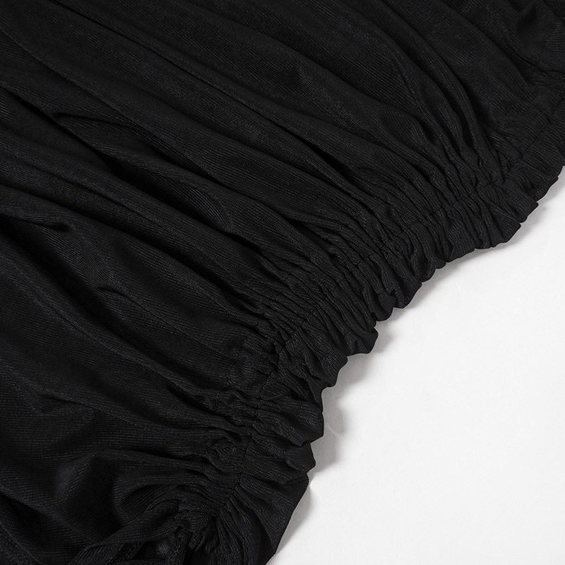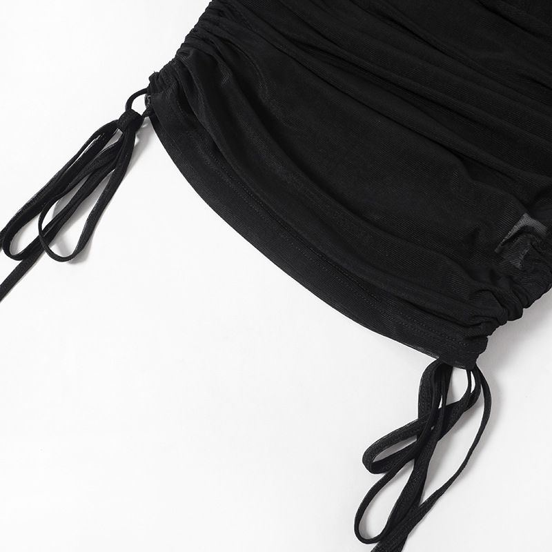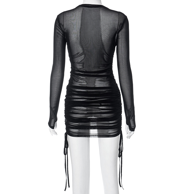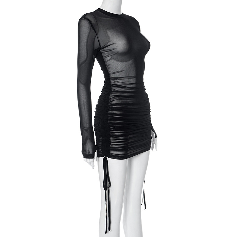 Vestido blusa larga y corta ajustable con cuello redondo y manga larga de malla plisada para mujer