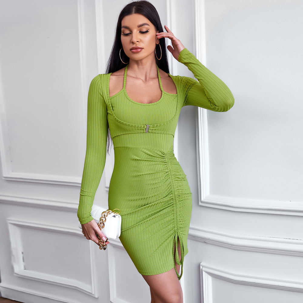 Vestido corto de dos piezas con pliegues y manga larga para mujer, ajustado, de punto, ajustado, minivestido