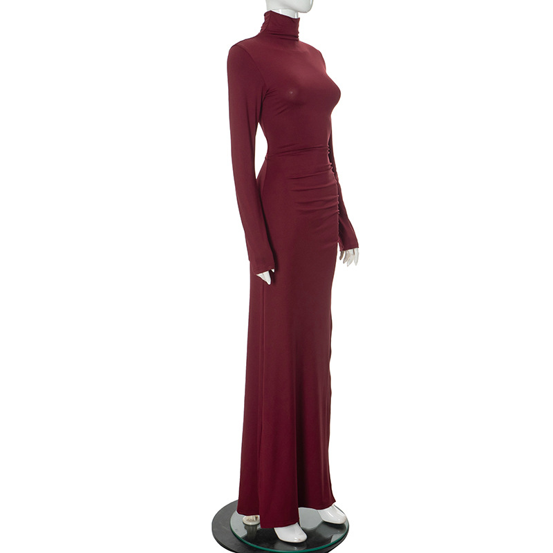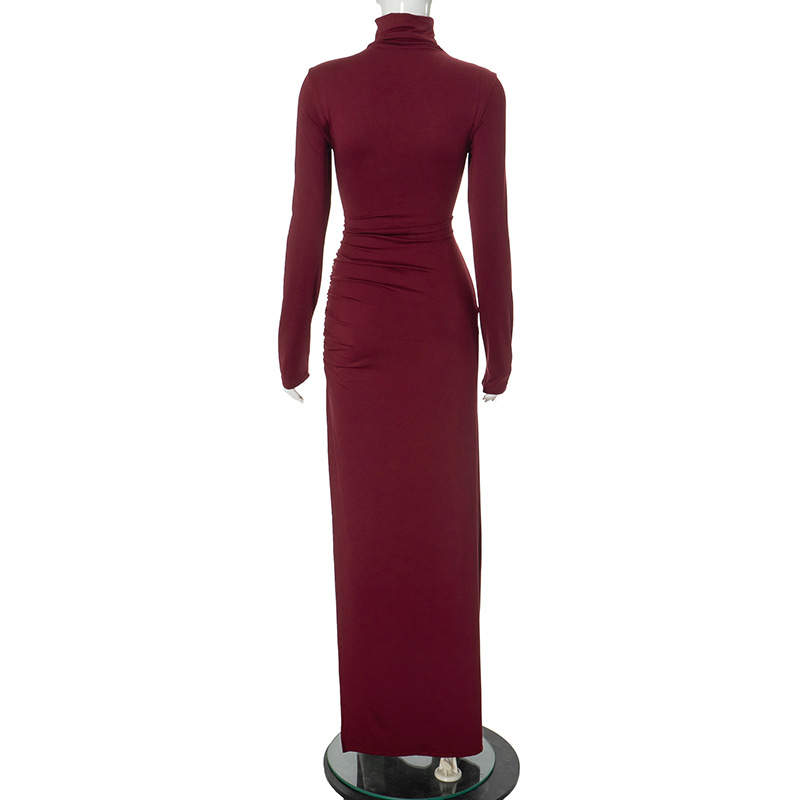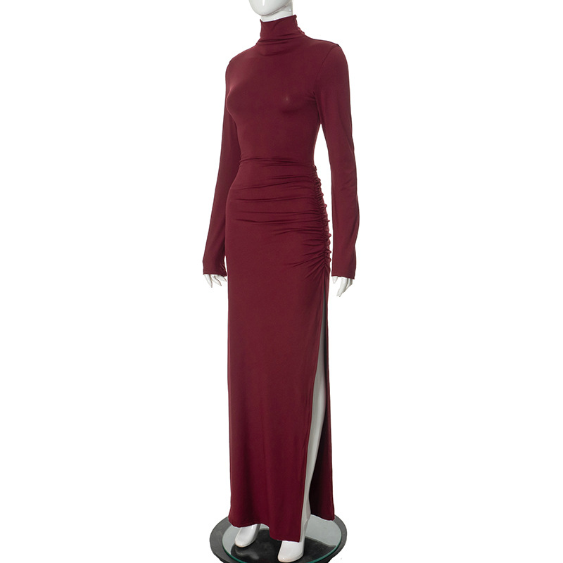 Vestido largo elegante de mujer, cuello alto, corte entallado, manga larga y abertura alta