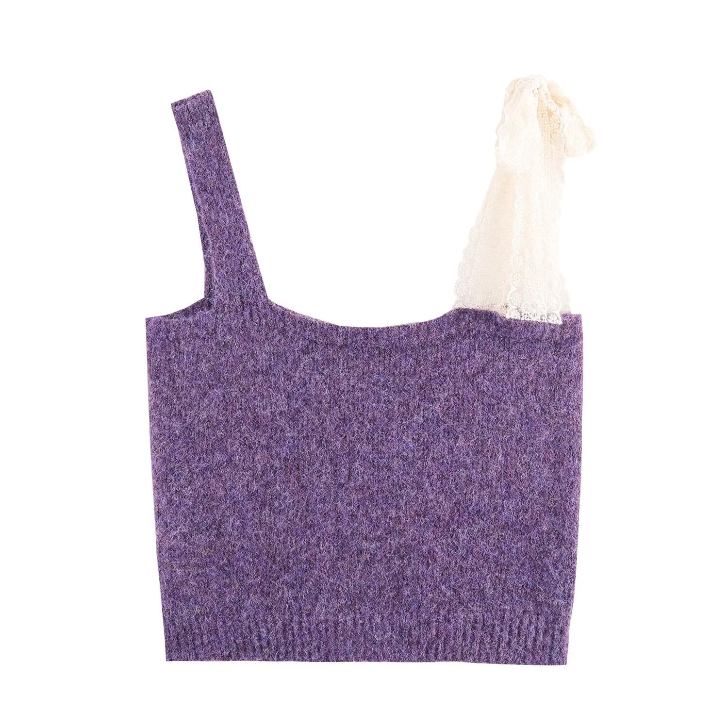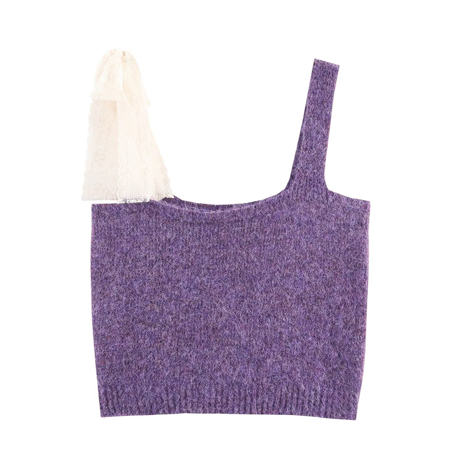 Women Lace Collared Blouse Shoulder Strap Two Piece Knitted Cardigan Set