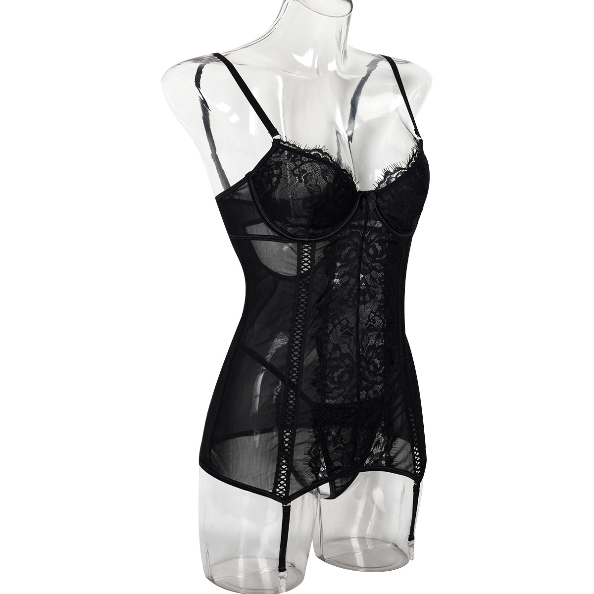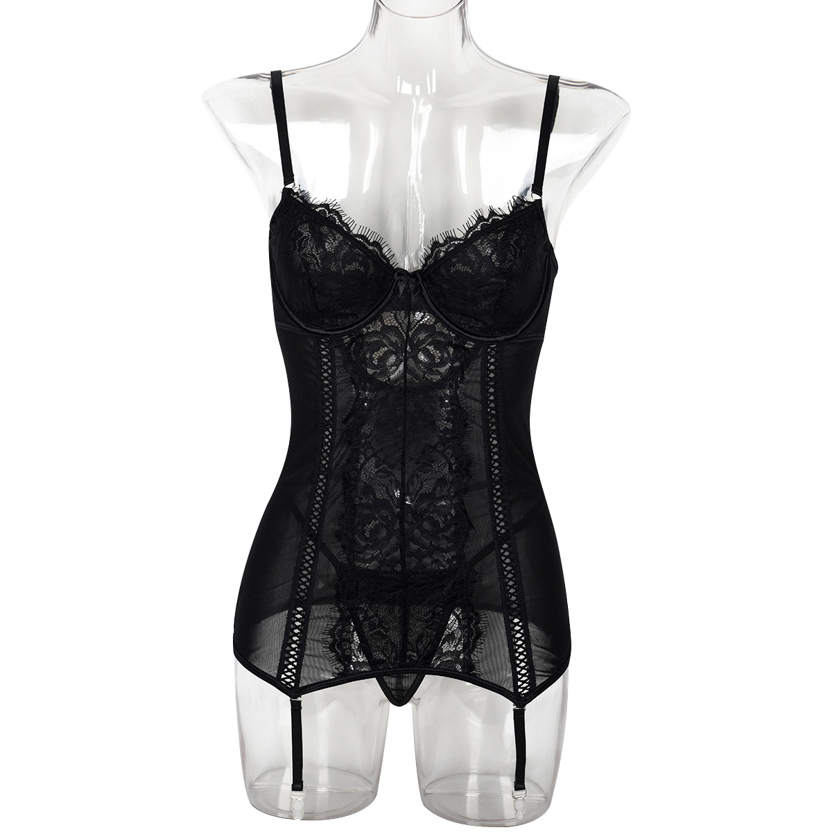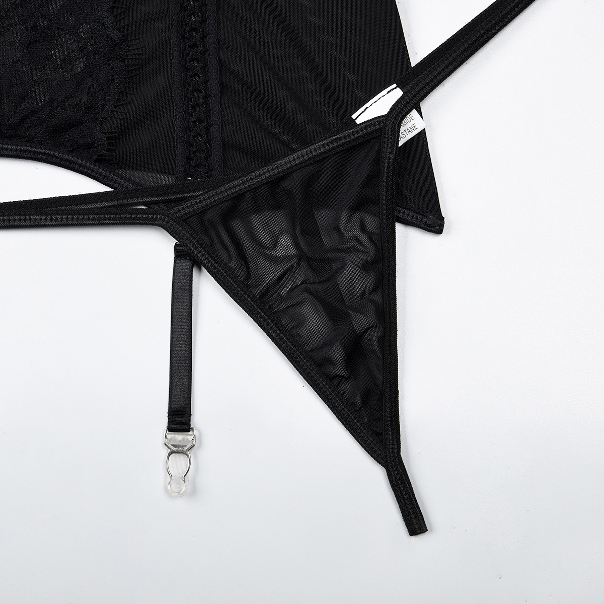 Conjunto de lencería sexy con espalda en T y encaje con pestañas cosidas para mujer