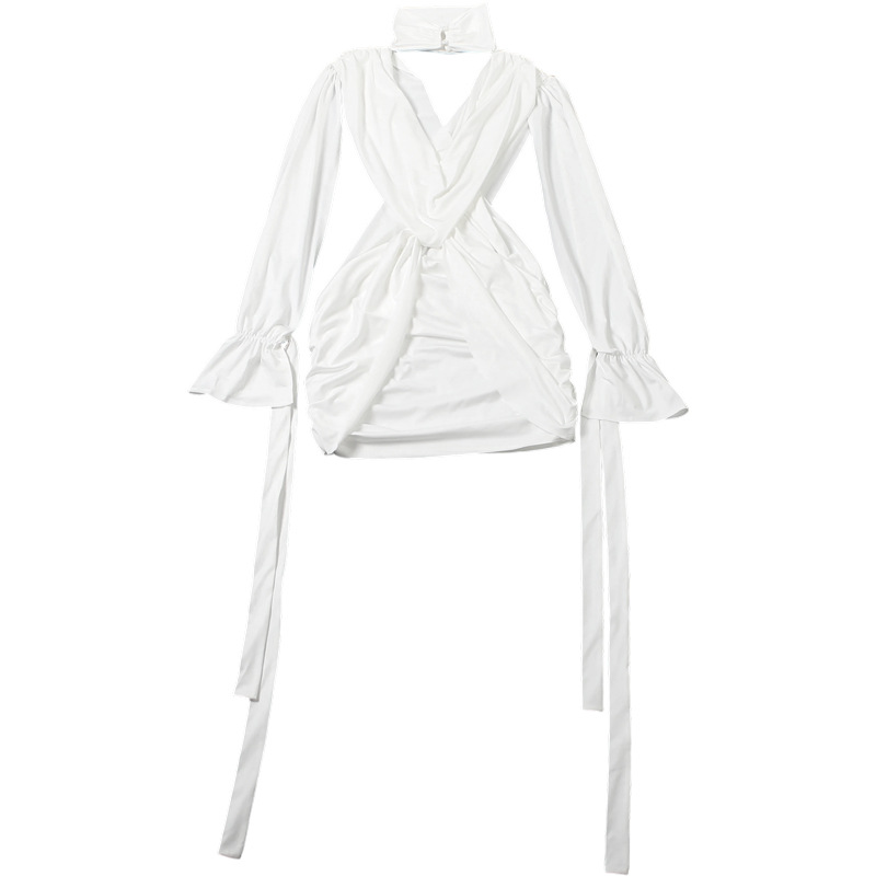 Autumn Winter Women Solid Color Sexy Hollow Out Cutout Long Sleeved Deep V Plunge neck Cross Stitching Hip Dress