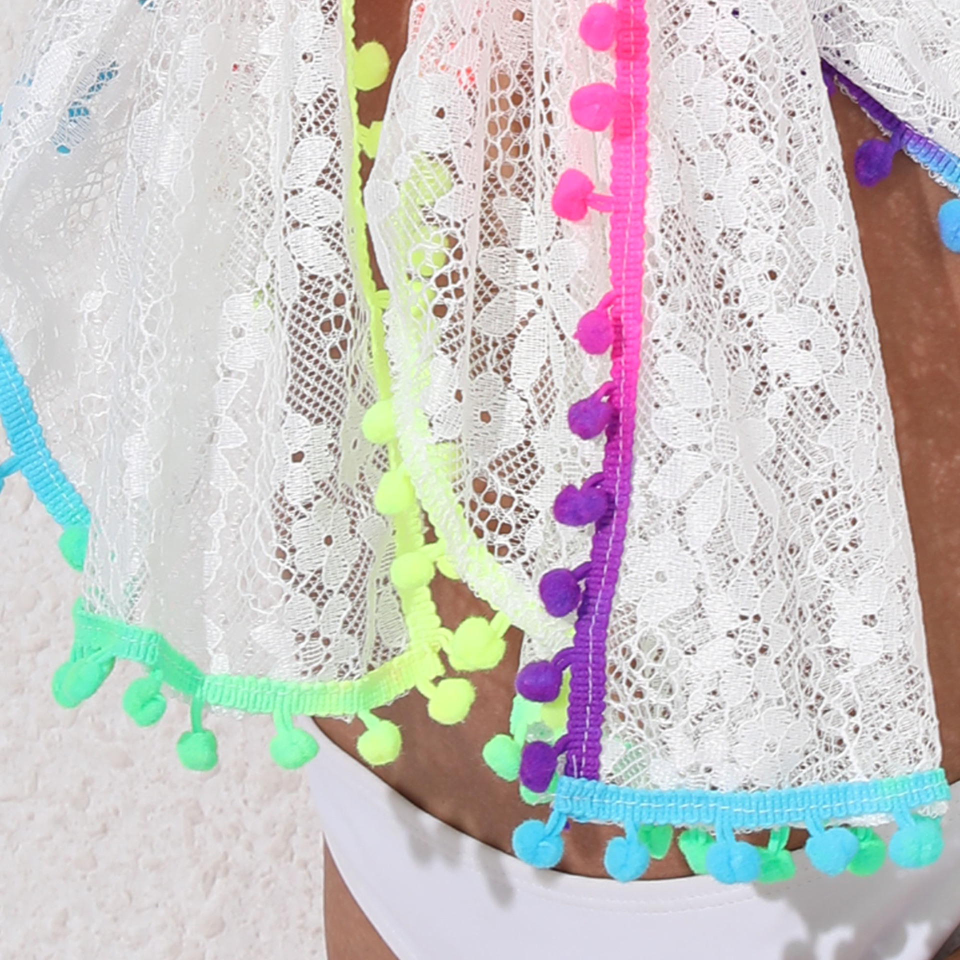 Châle de plage pour femmes, vêtements multicolores, coutures à pompons, sexy, transparent, dentelle irrégulière, asymétrique, une pièce