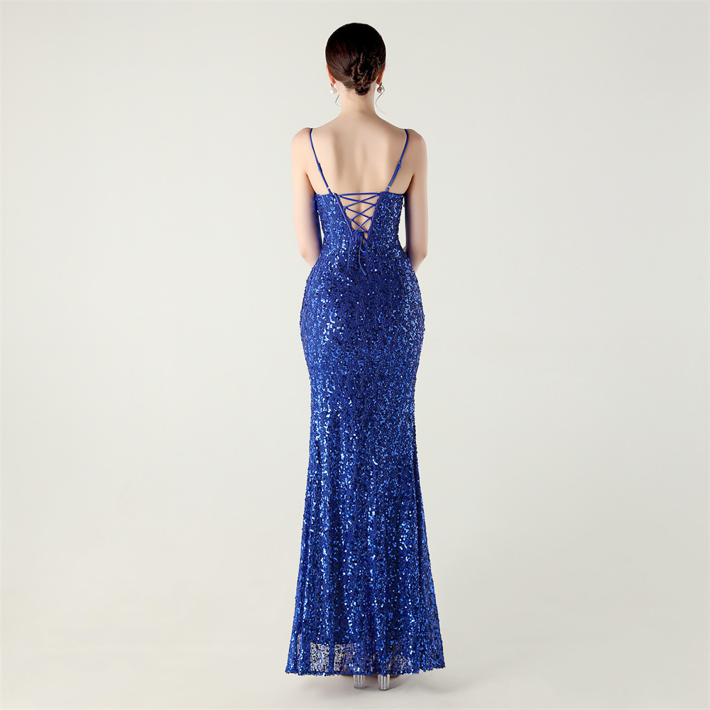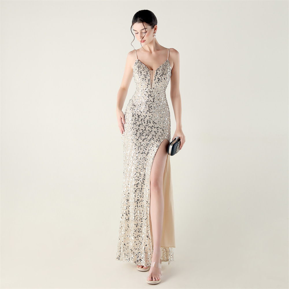 Bead Tube Sequin Spaghetti Strap High Slit Evening Dress Cross Tied Slim Fit Slimming Dinner Social Women