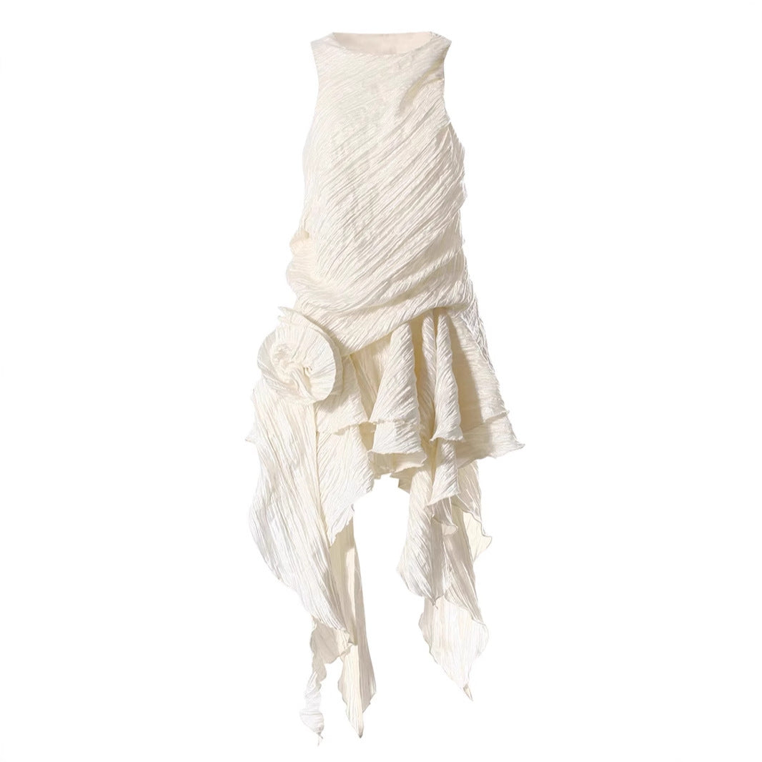 Pleated Three Dimensional Dress Summer Retro Floral Texture Irregular Asymmetric Ruffled Sleeveless Dress