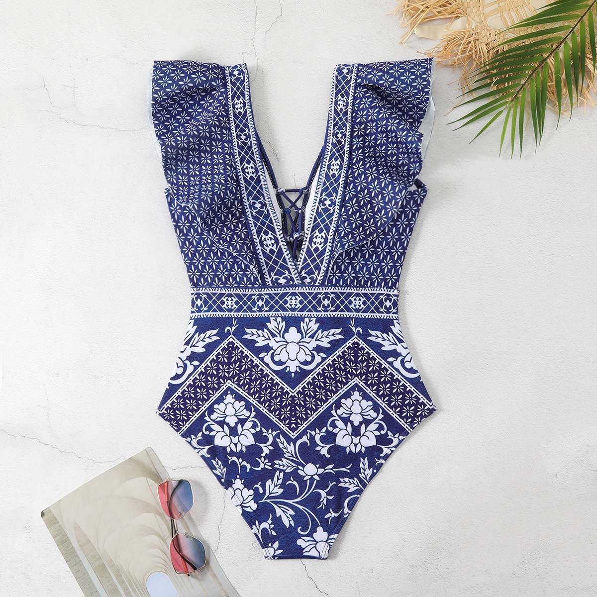 Maillot de bain dos nu sexy à volants et décolleté en V profond pour femme