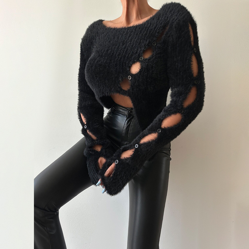 Pull court ajouré à manches longues et col rond pour femme, couleur unie, tricoté