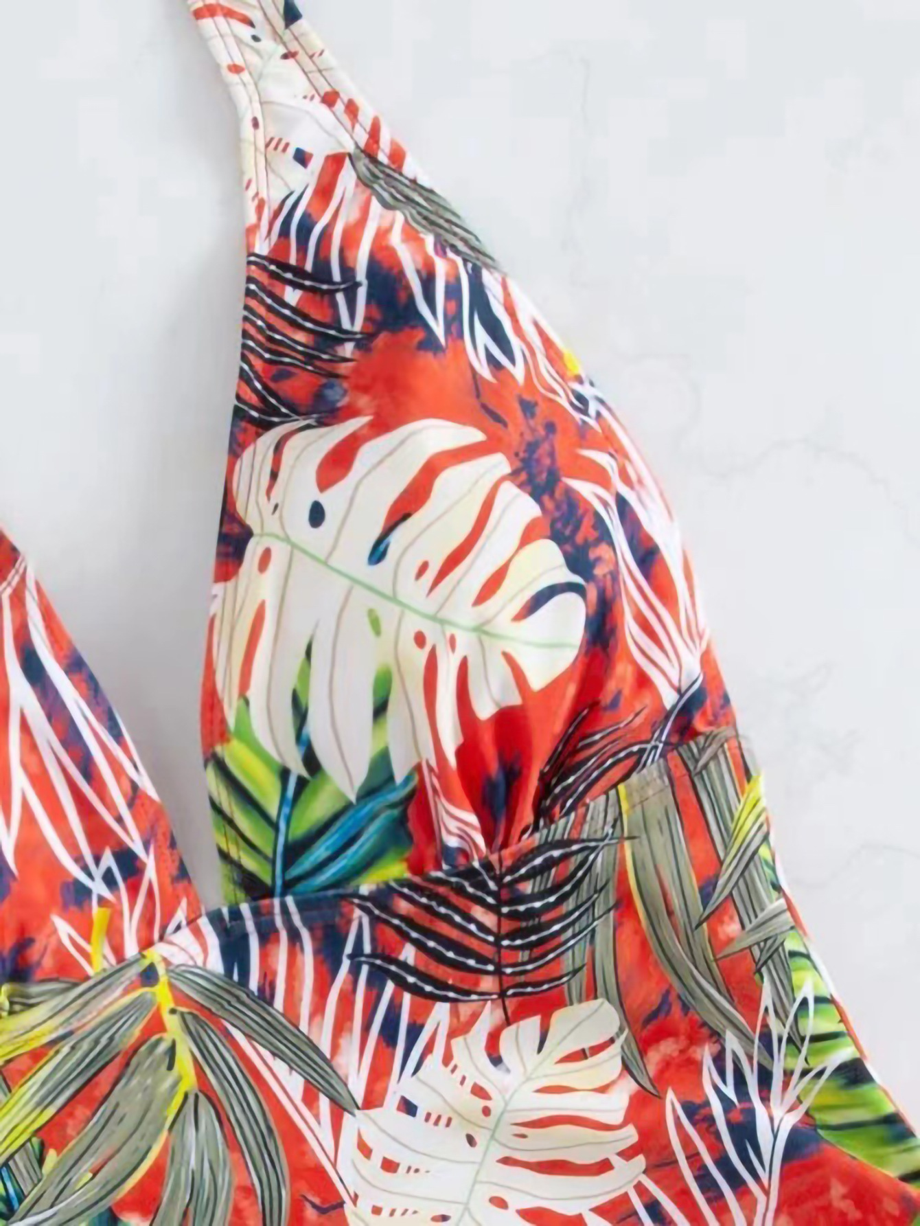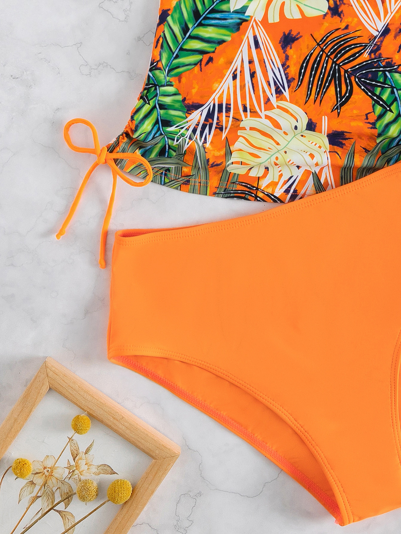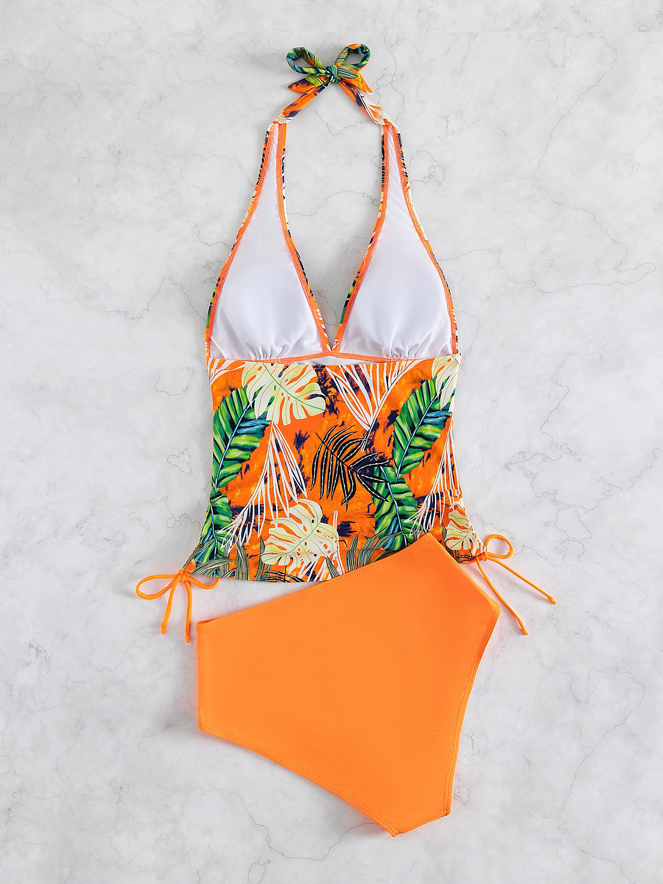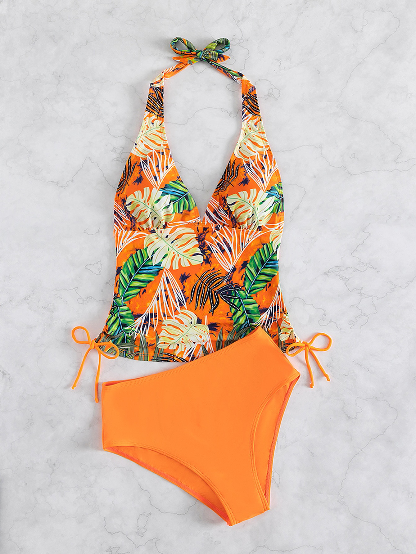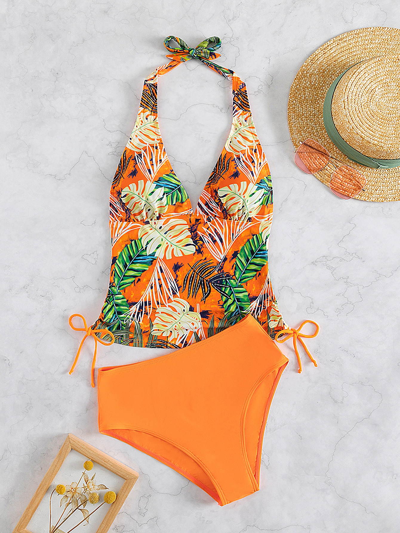 Maillot de bain femme triangle fendu à lacets couleur unie imprimé feuilles