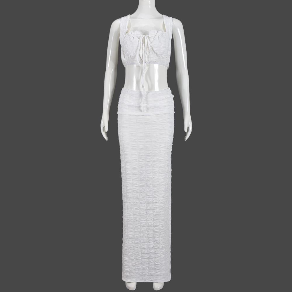 Women Clothing Autumn Lace up Cropped Pleated Sexy Skirt Set