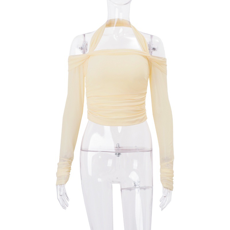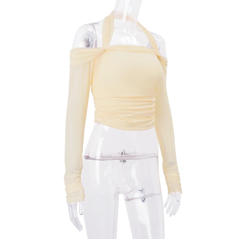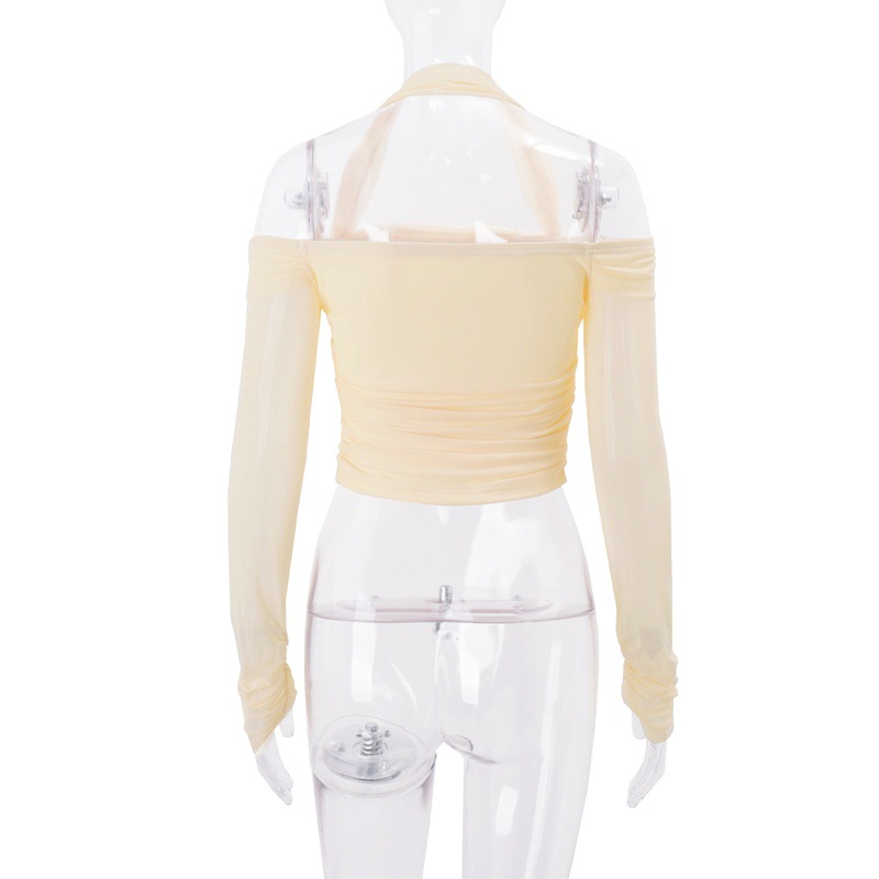 Women Clothing Autumn Sexy off Neck Solid Color Halter Cropped Long Sleeve Top for Women