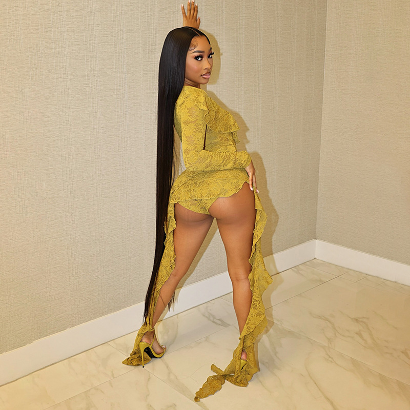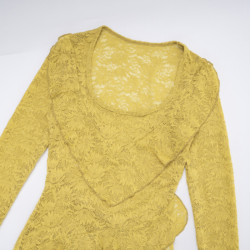 Women Clothing Autumn Solid Color Sexy Ribbon Lace Long Sleeve Short Dress Underwear