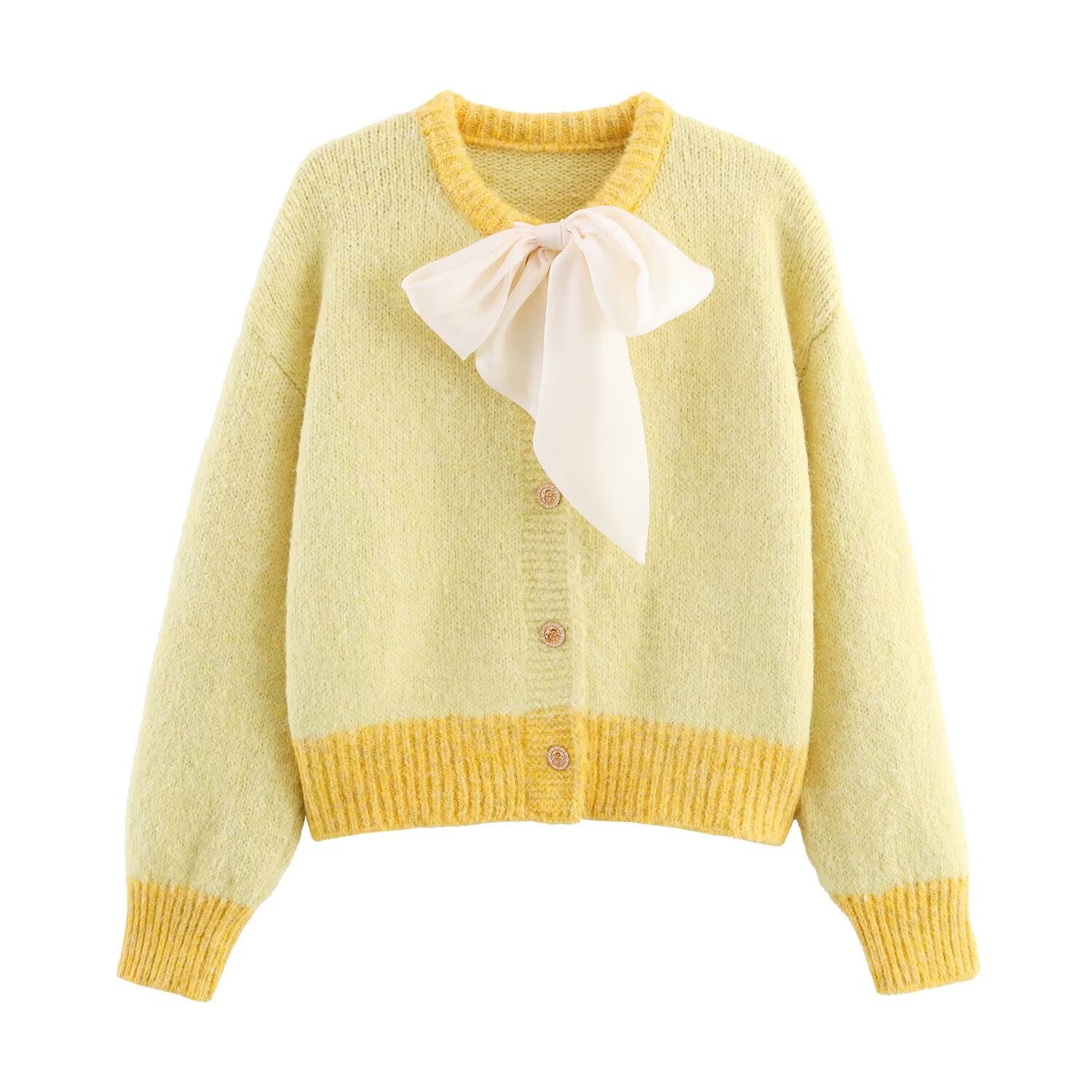 Women Clothing Fall round Neck Long Sleeve Bowknot Decorative Knitwear Coat