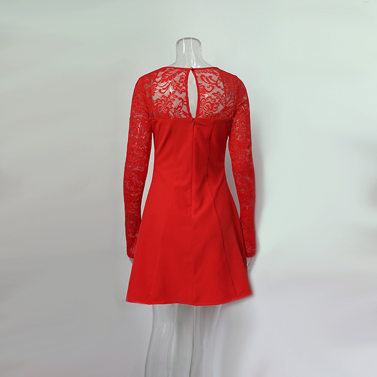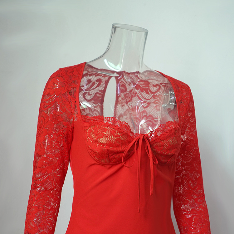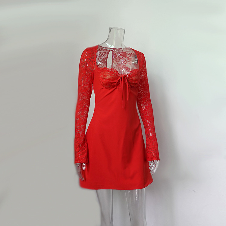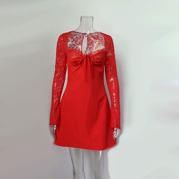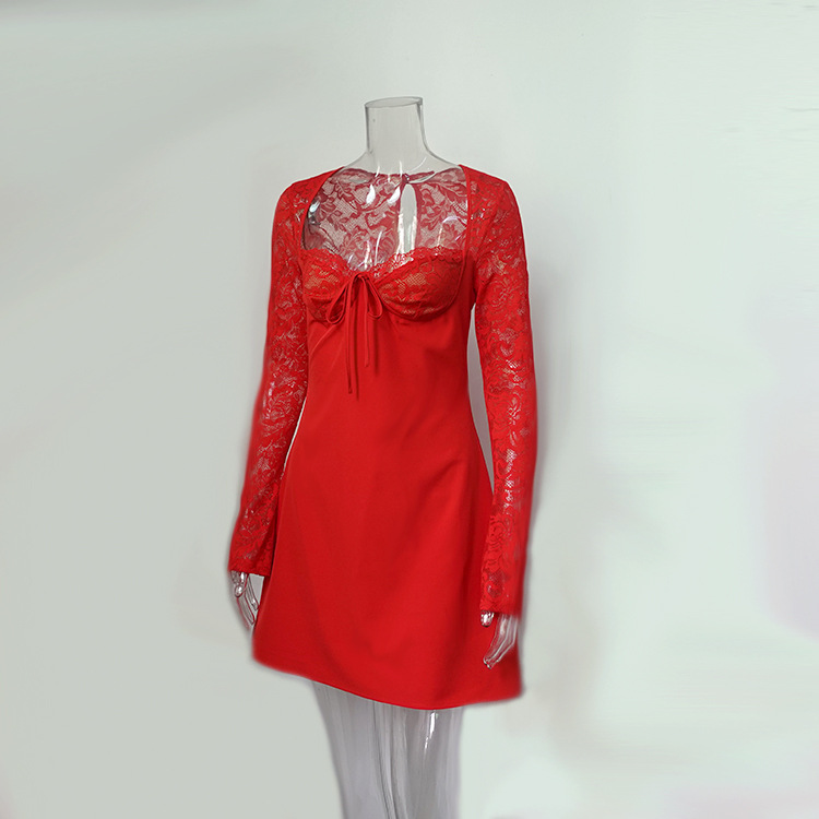 Women Clothing Sexy Dress Lace Stitching Long Sleeve Tied Chest Wrapped Dress