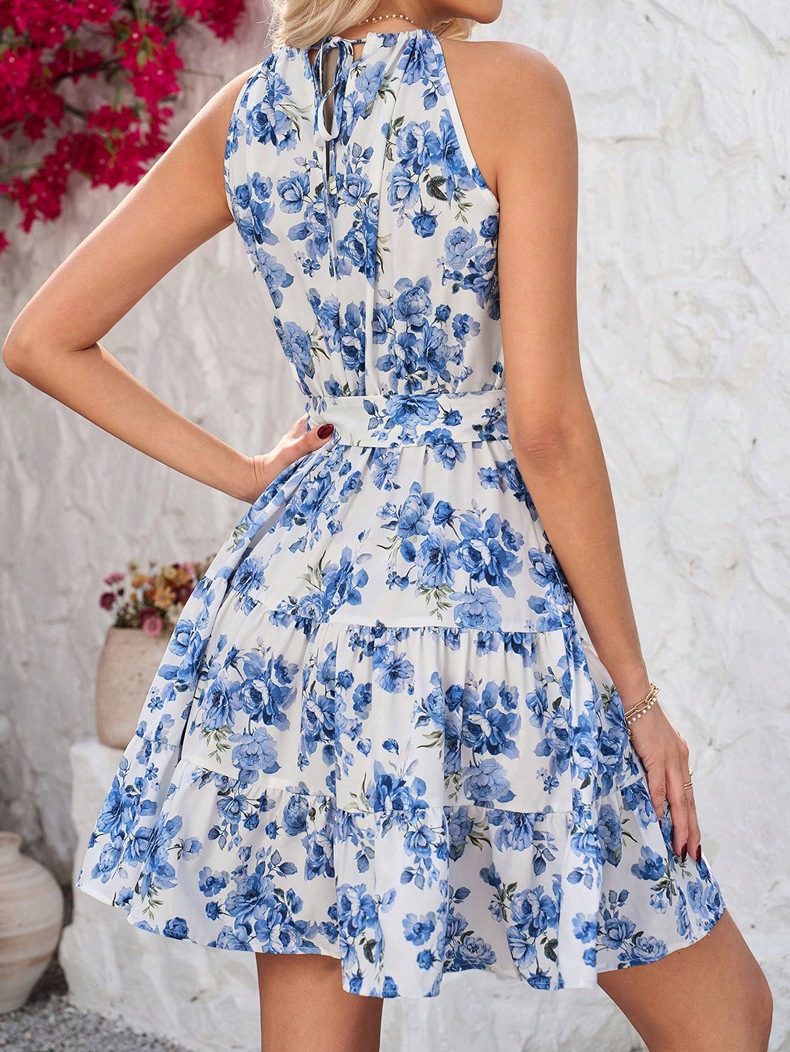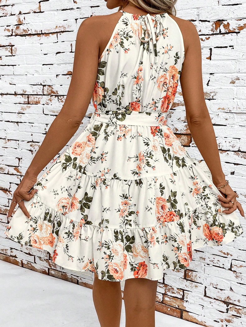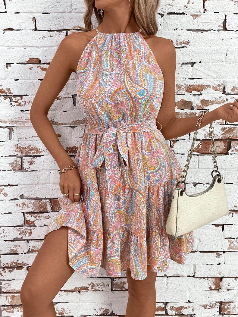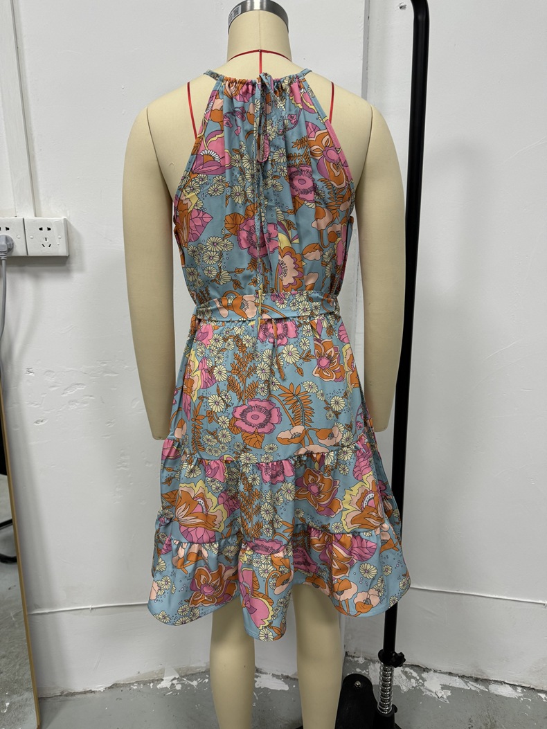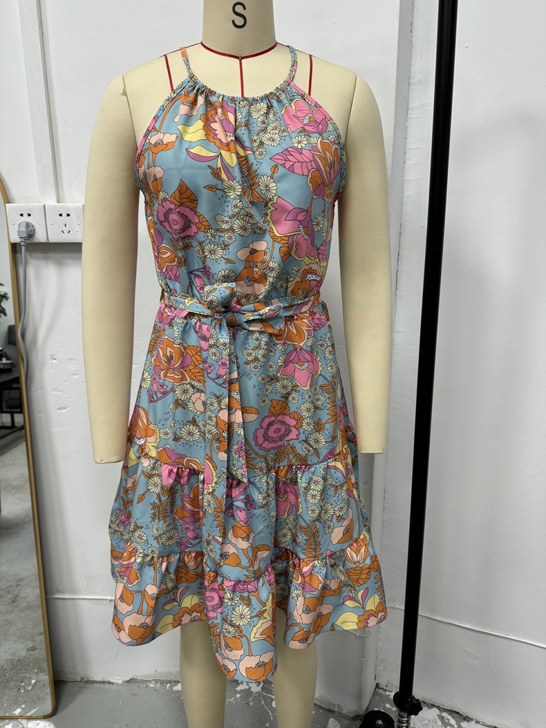 Women Spring Summer Dress Women Lace Printing Sling Mid Length Dress