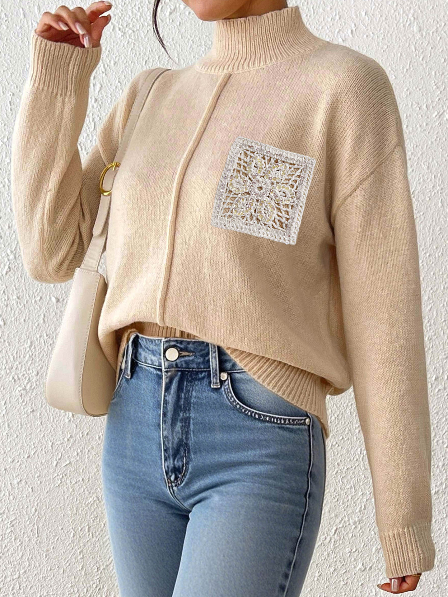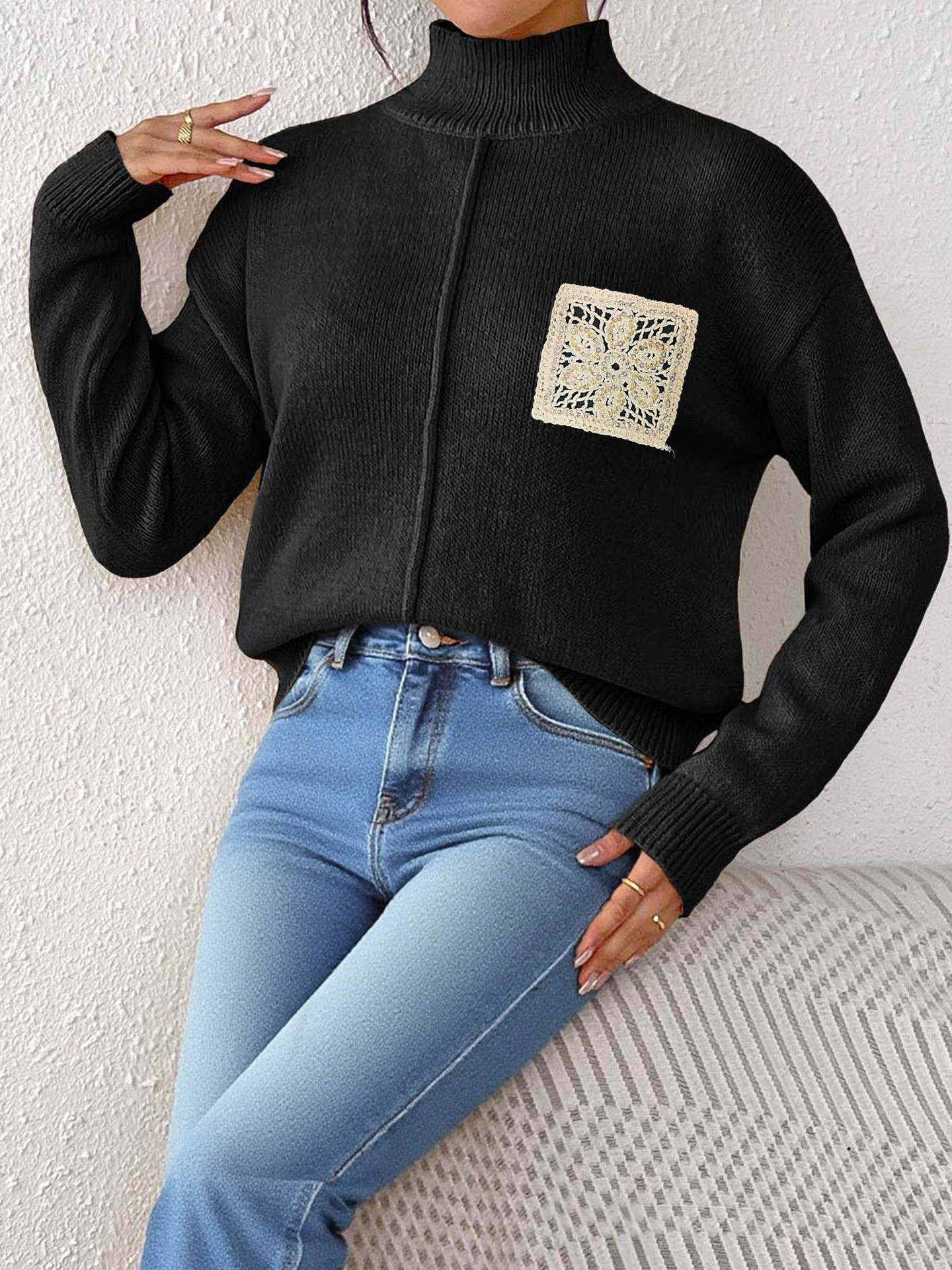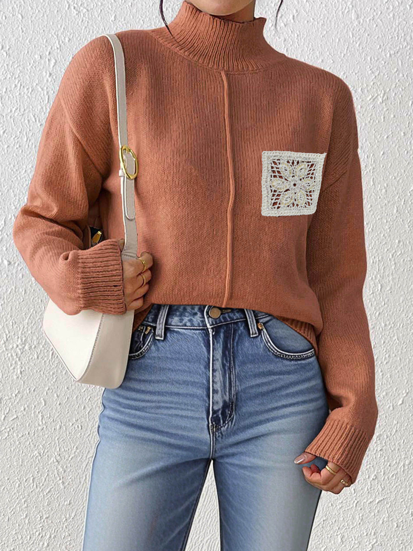 Autumn Winter Women Clothing Solid Color Half Collar Pullover Sweater Sequined Hollow Out Cutout Pocket Stitching Sweater for Women