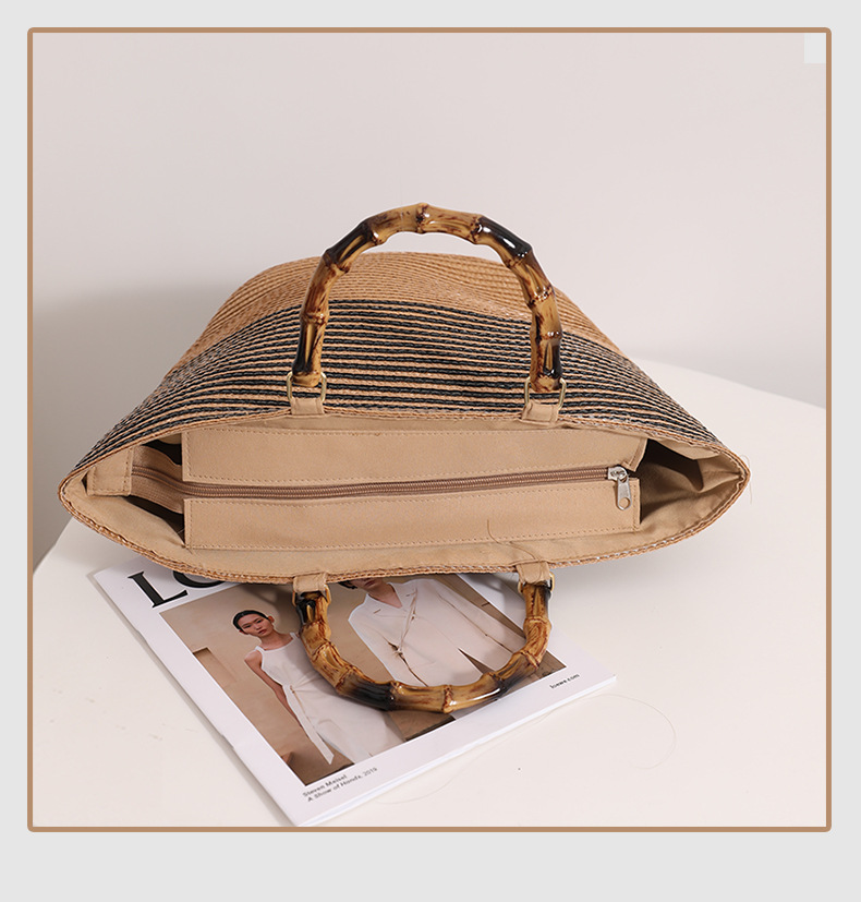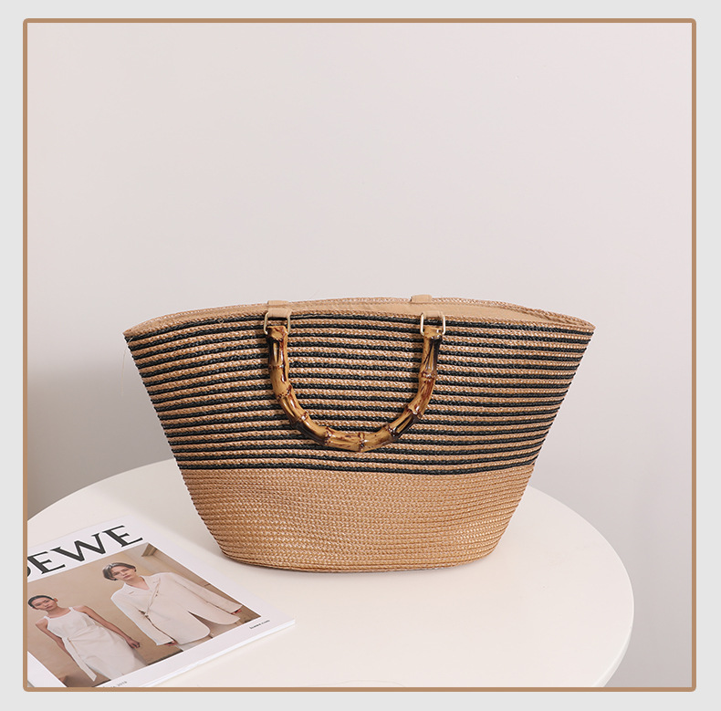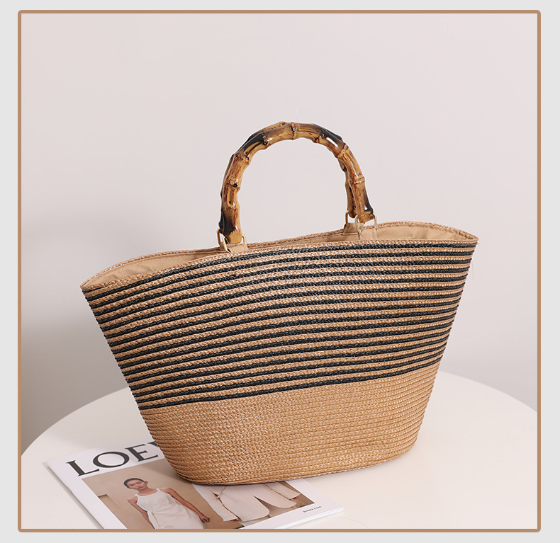 Sac en paille de bambou à rayures, grande capacité, pour femme, fourre-tout tissé, sac à main, panier à légumes