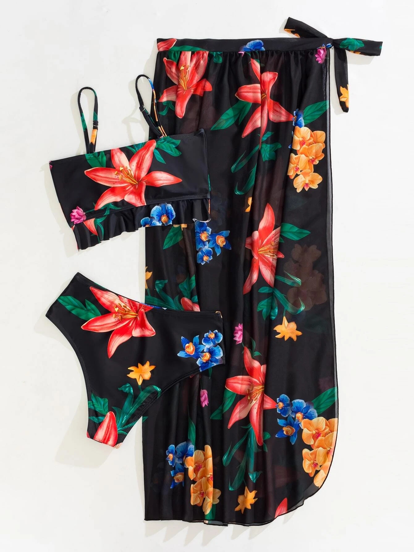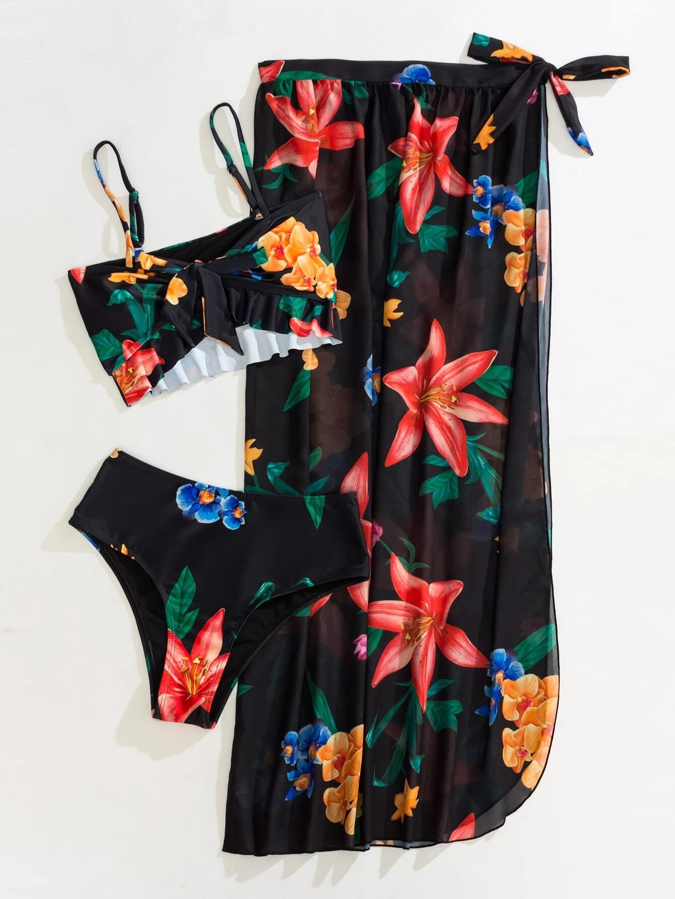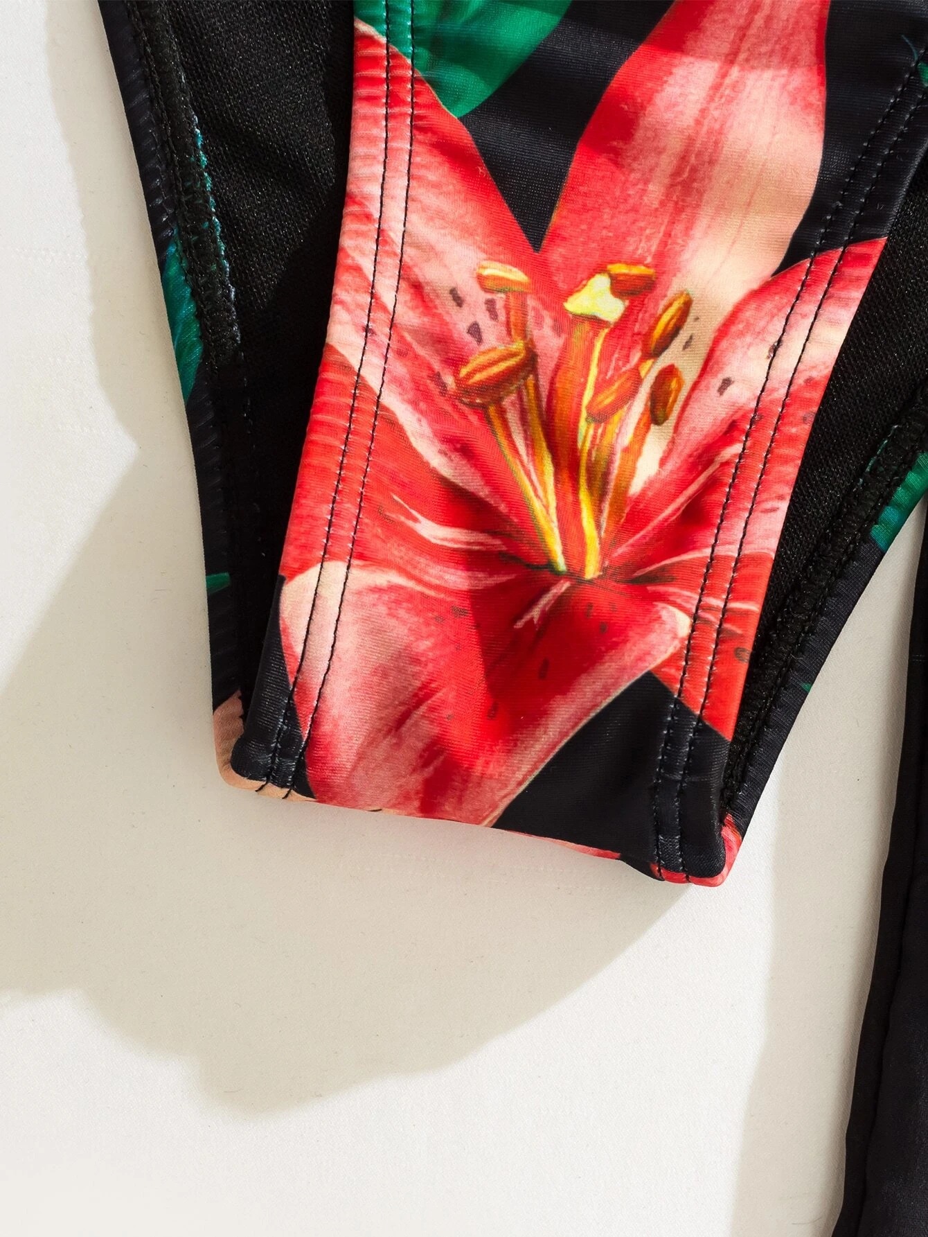 Maillot de bain trois pièces imprimé fendu pour femme, taille haute, triangle, nœud