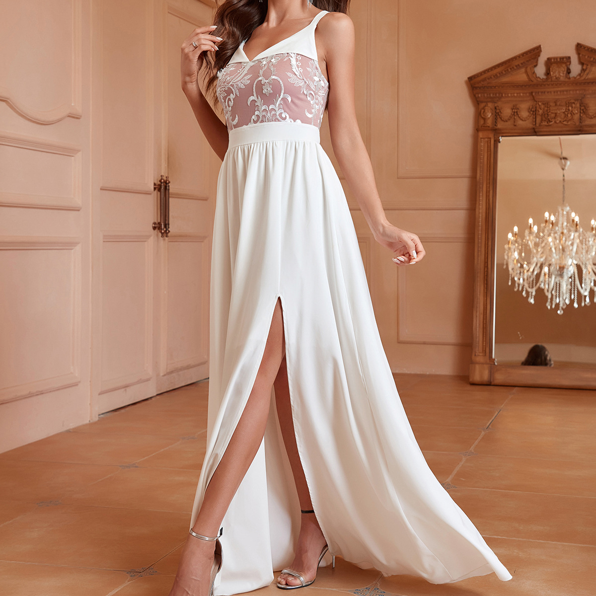 V neck Brace Elegant Slim Long Slit Backless Women Long Prom Dress