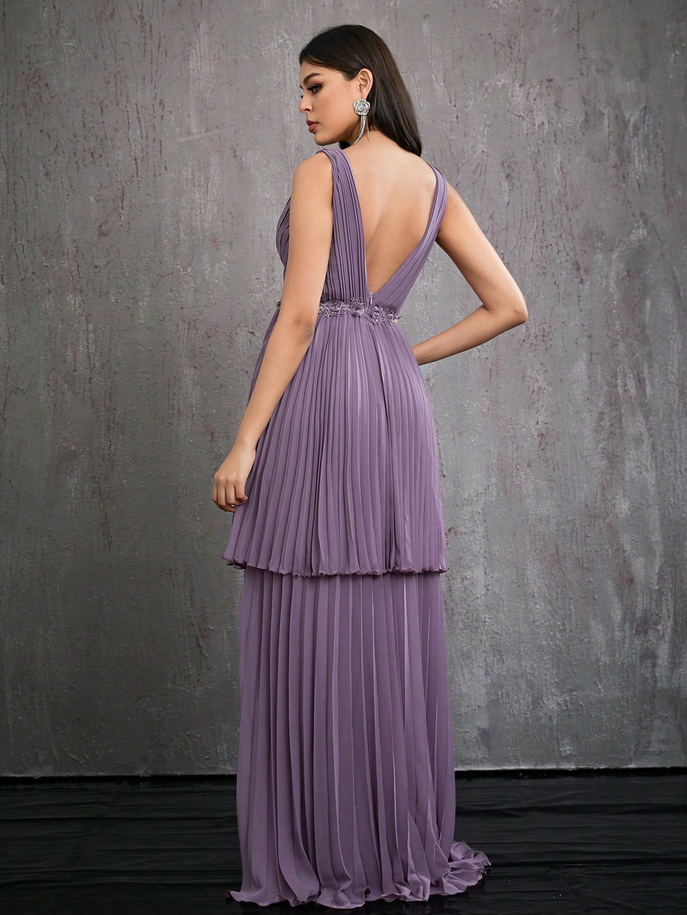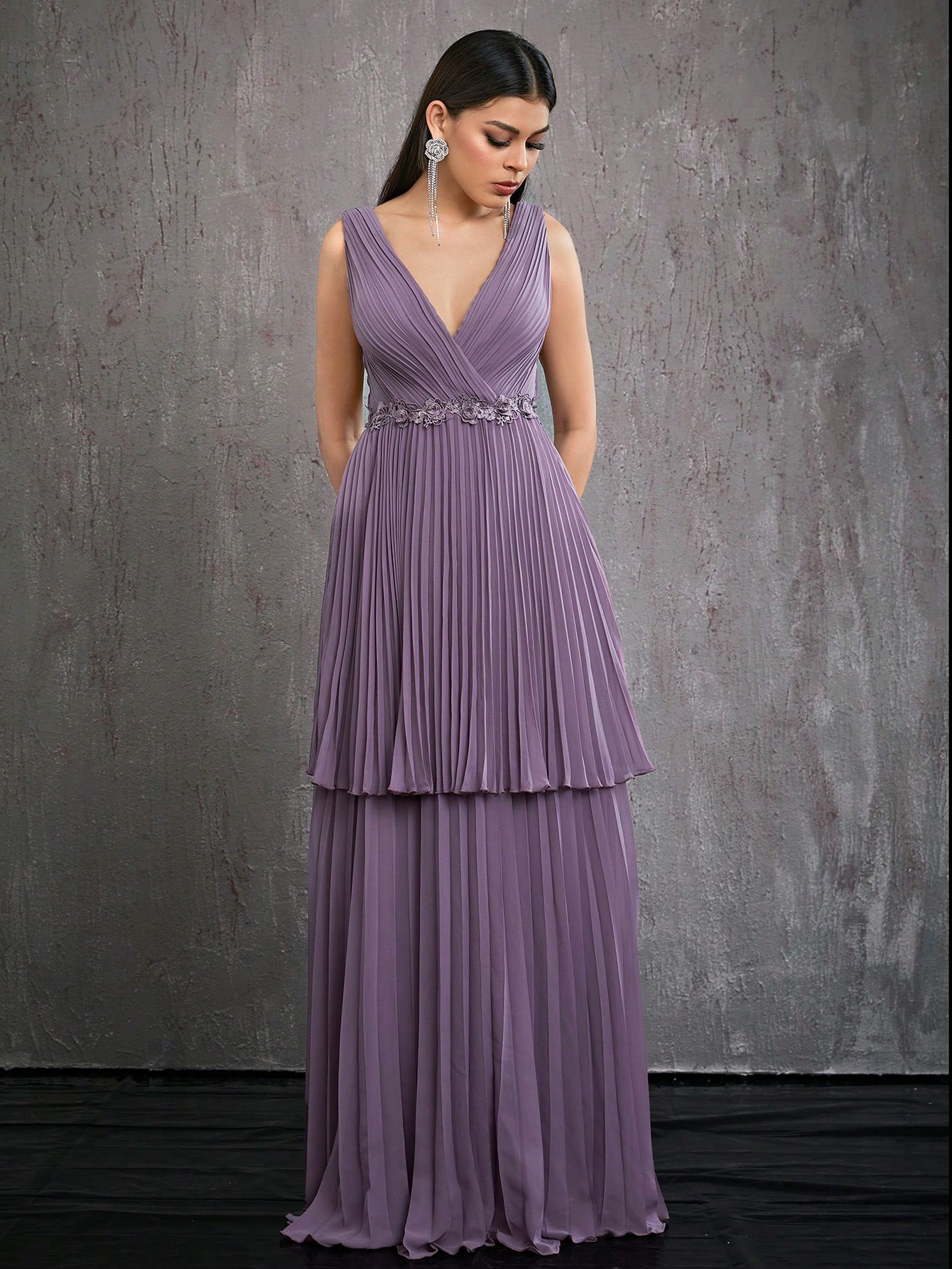 V neck Prom Evening Dress Tiered Dress Layered Cross Collar Host Formal Dress Elegant Graceful Dress Maxi Dress Women