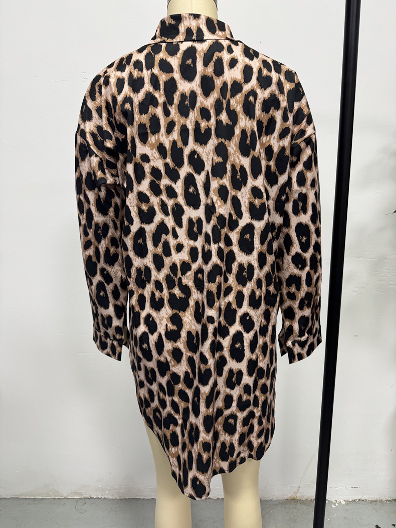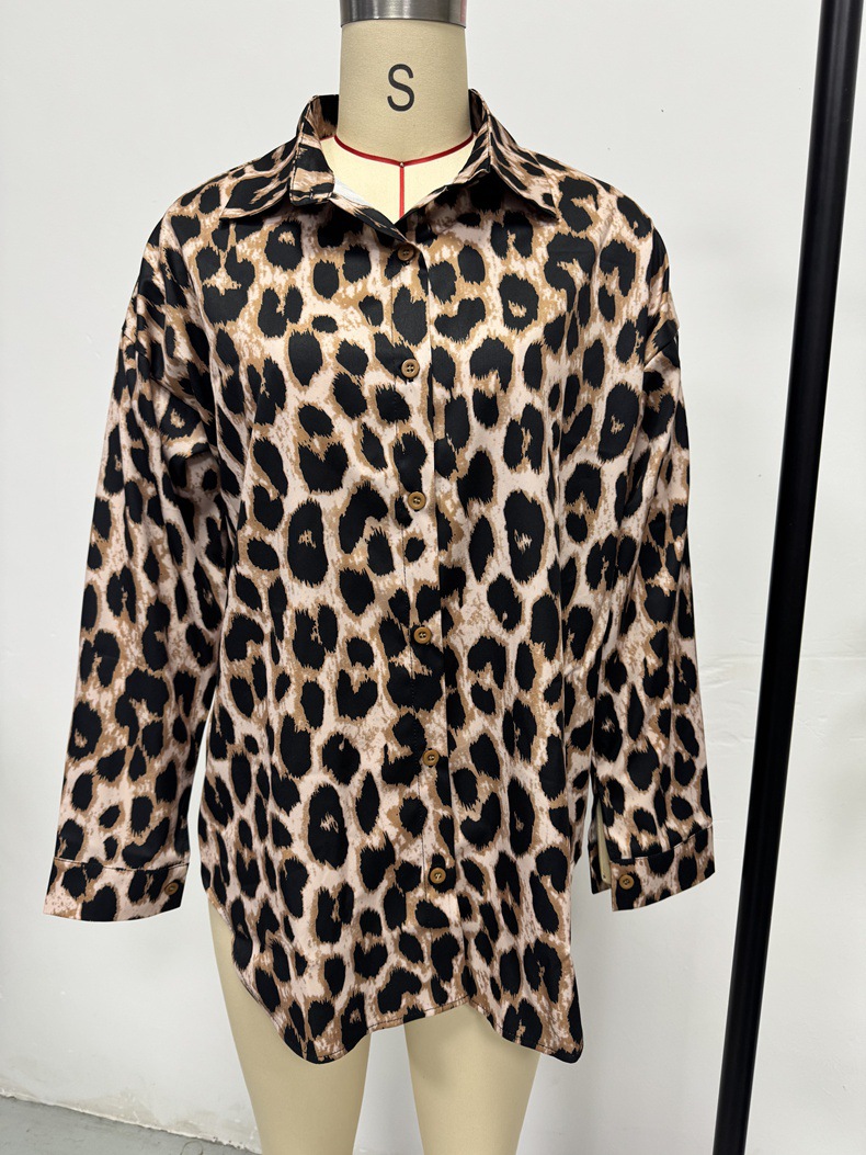 Women Autumn Satin Leopard Print Shirt Printed Long Sleeve Long Shirt