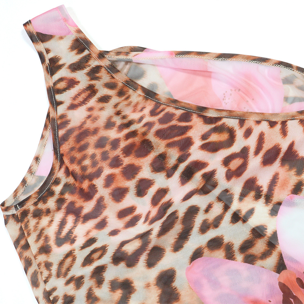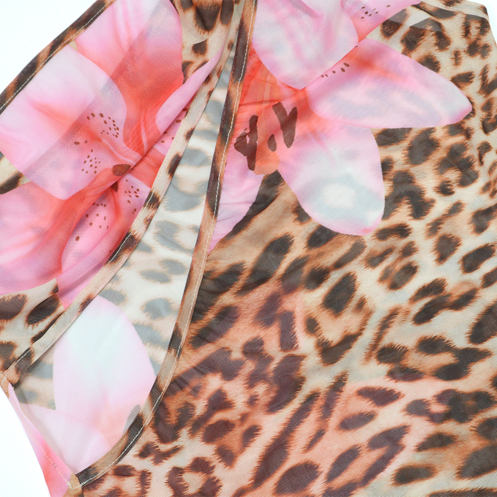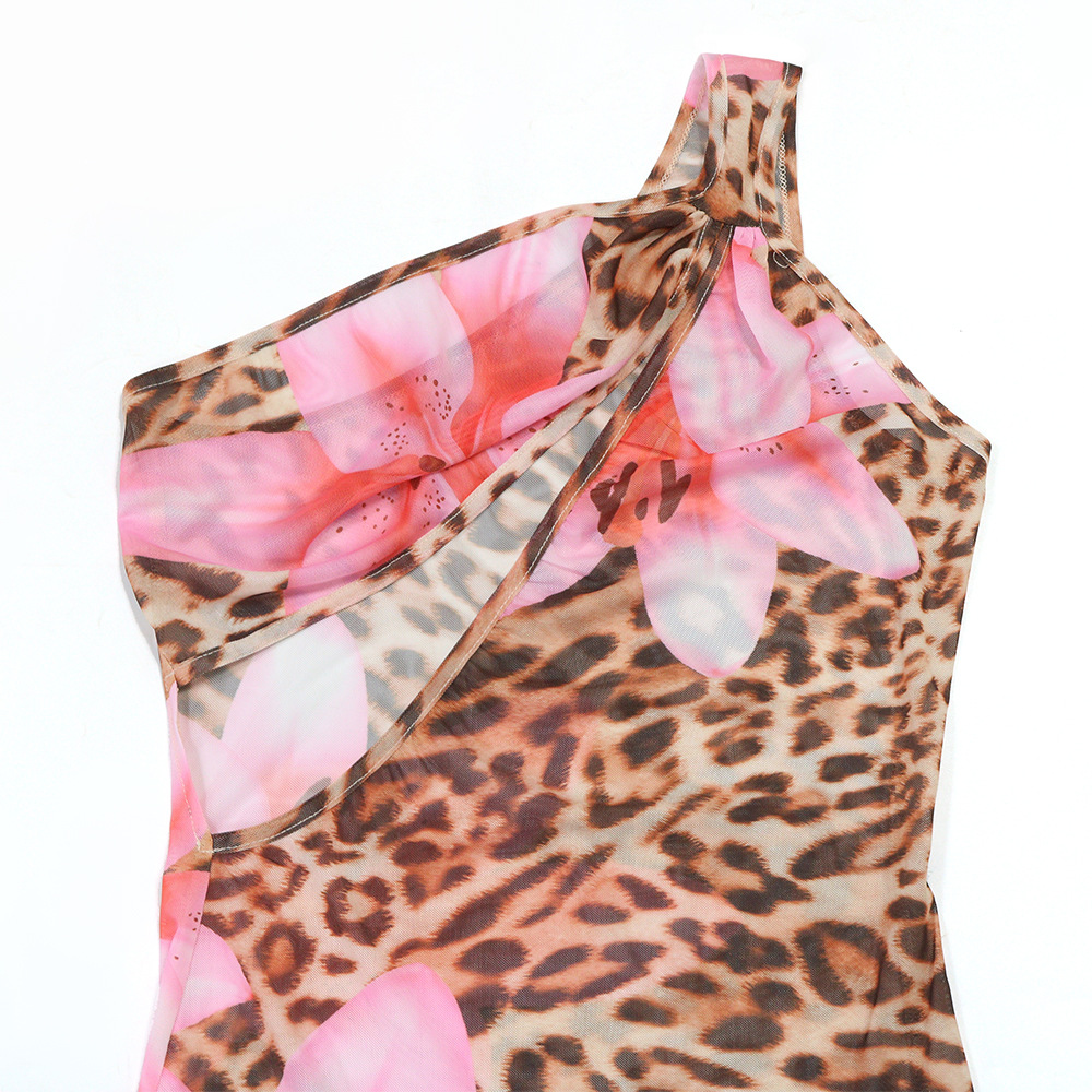 Women Clothing Diagonal Collar Hollow Out Cutout out See through Mesh Floral Print Dress
