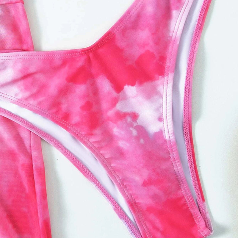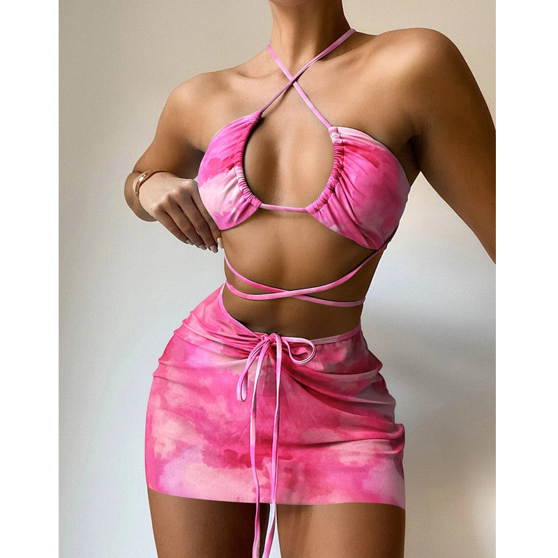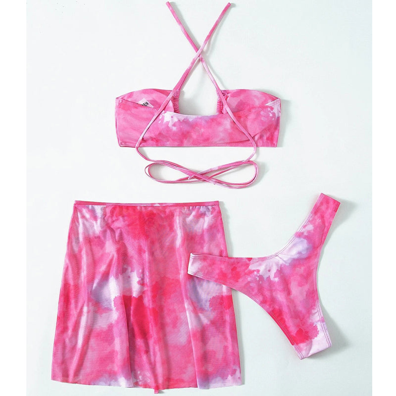 3 pieces mesh skirt swimwear Tie dye bikini Hollow Out Cutout out bandeau swimsuit women swimming suit String bathing suit Beachwear
