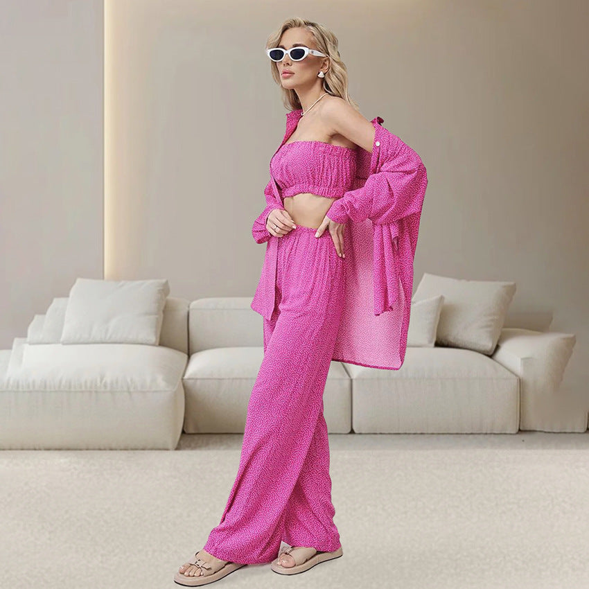 Autumn Blue Color Leopard Print Pajamas Tube Top Cardigan Long Sleeve Pants Women Homewear