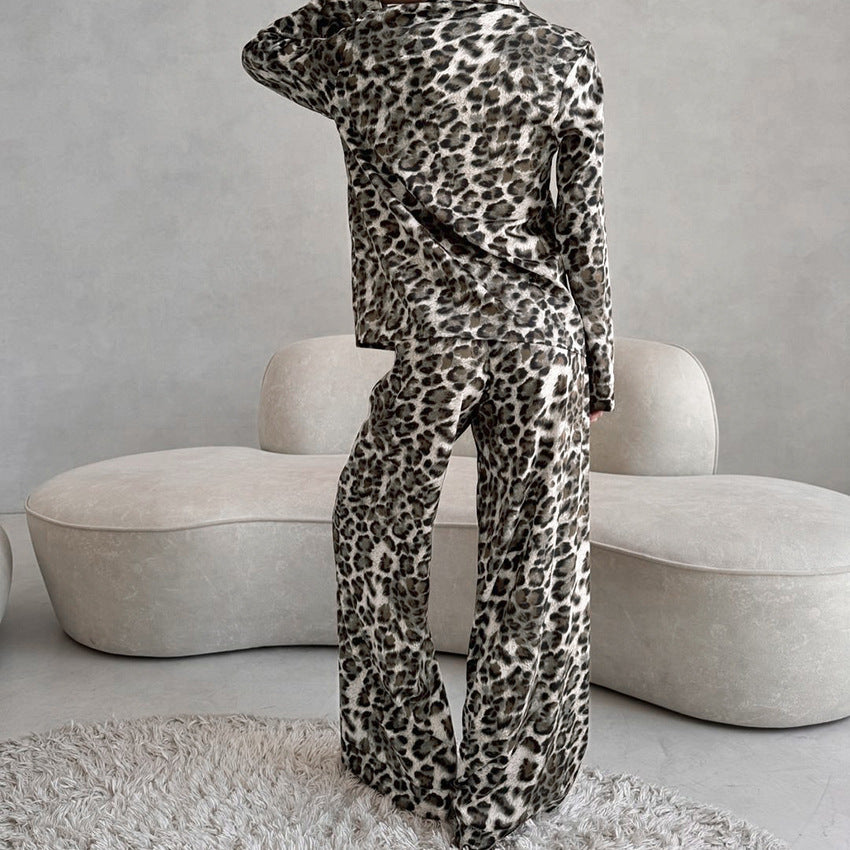 Autumn Satin Leopard Print Soft Comfortable Pajamas Long Sleeved Trousers Women Homewear