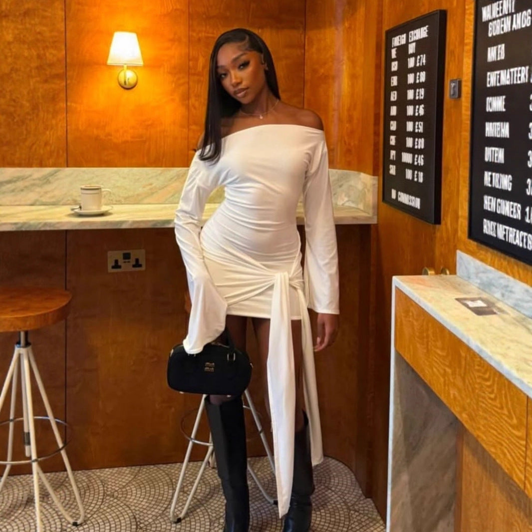 Autumn Winter Graceful Fashionable Solid Color Women Shoulder Waist Controlled Lace up Sheath Dress