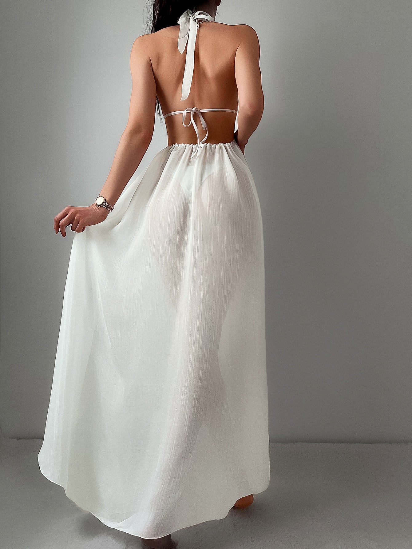 Beach Cover up Bikini Sun Protection Shacket Solid Color Halter Backless Long Swimsuit