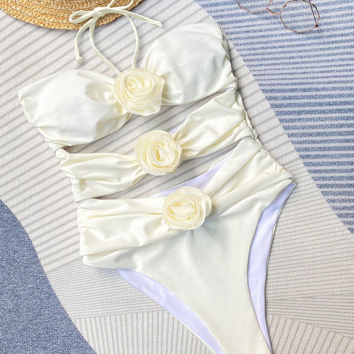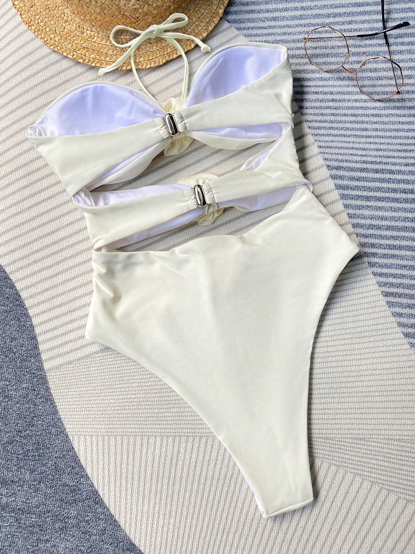 Bikinx Monochrome Halter Neck Flower Decoration Sexy One Piece Swimsuit