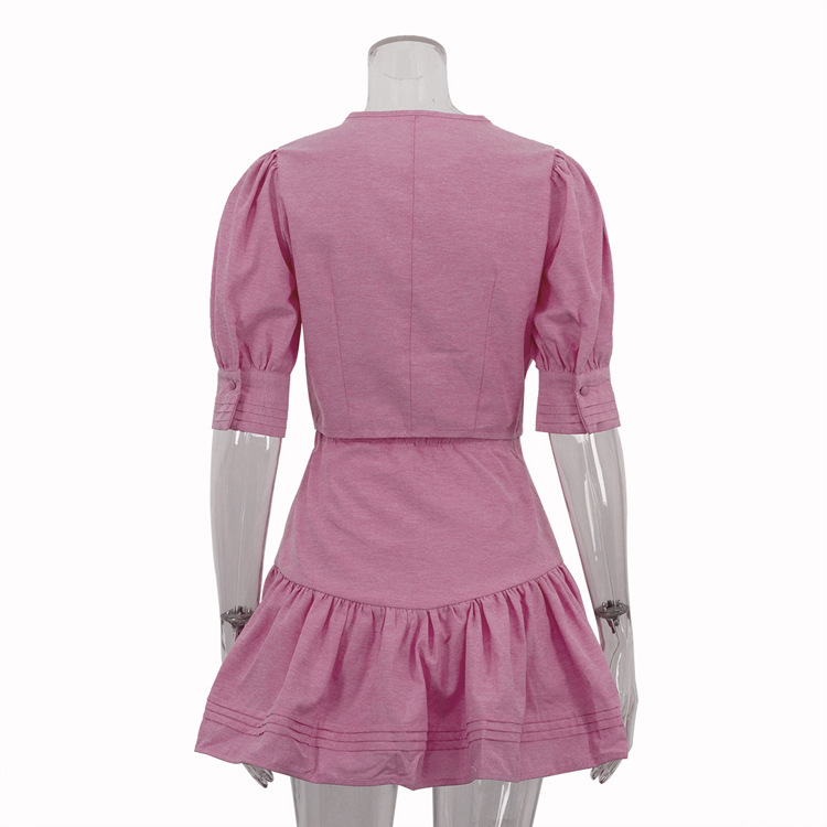 Casual Skirt Outfit Puff Sleeve Short Top Stitching A line Skirt Two Piece Set