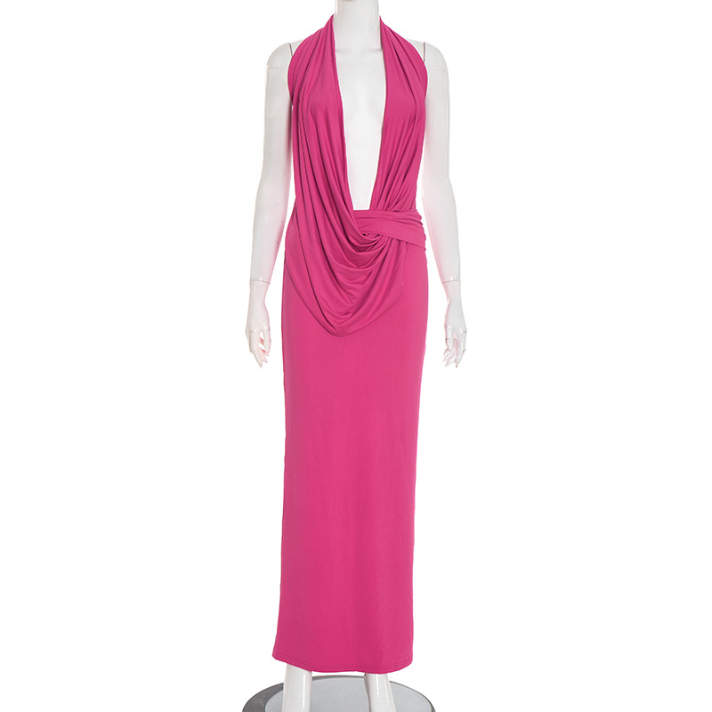 Clothing Autumn Slim Fit Halter Backless Sleeveless Pleated Lace up Elegant Length Dress