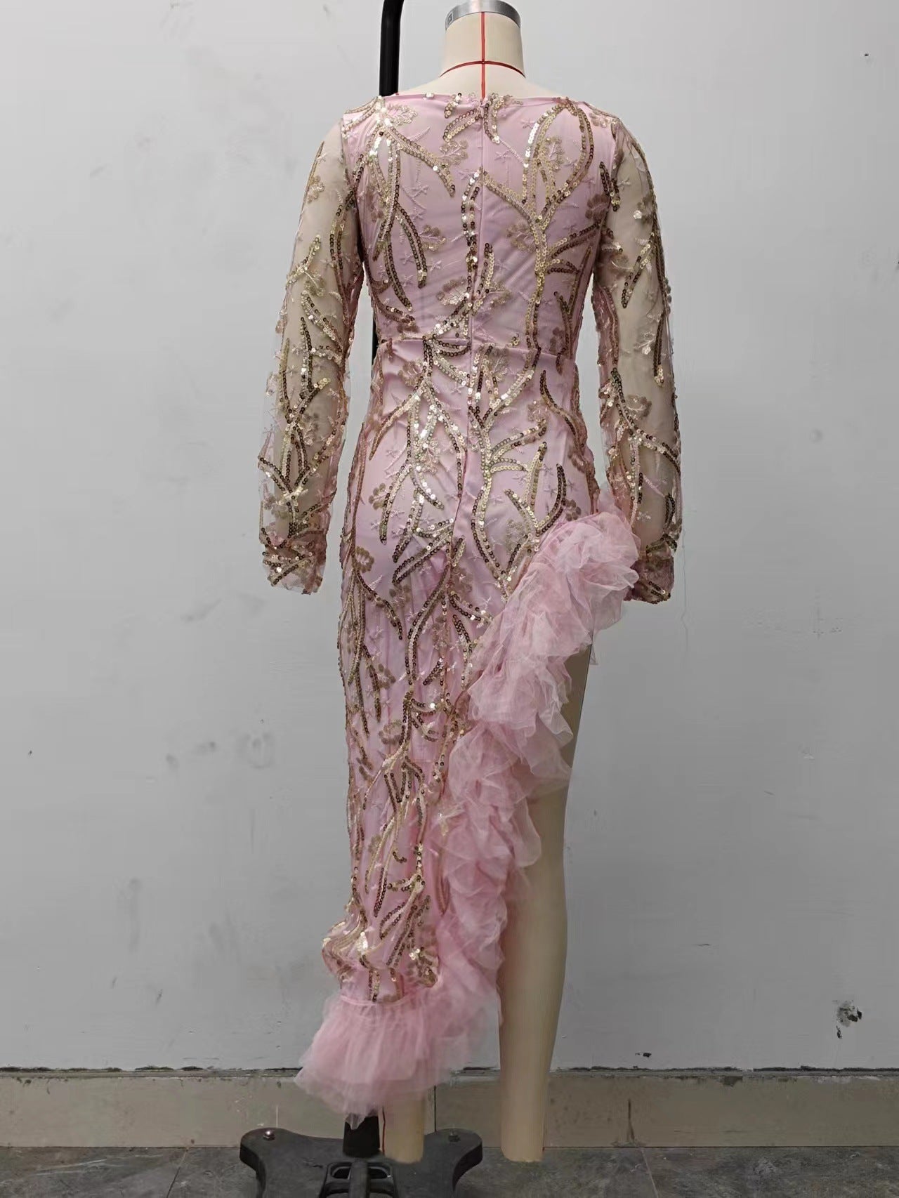 Fall Women Clothing Sexy Mesh Trailing Sequined Split Pink Evening Dress