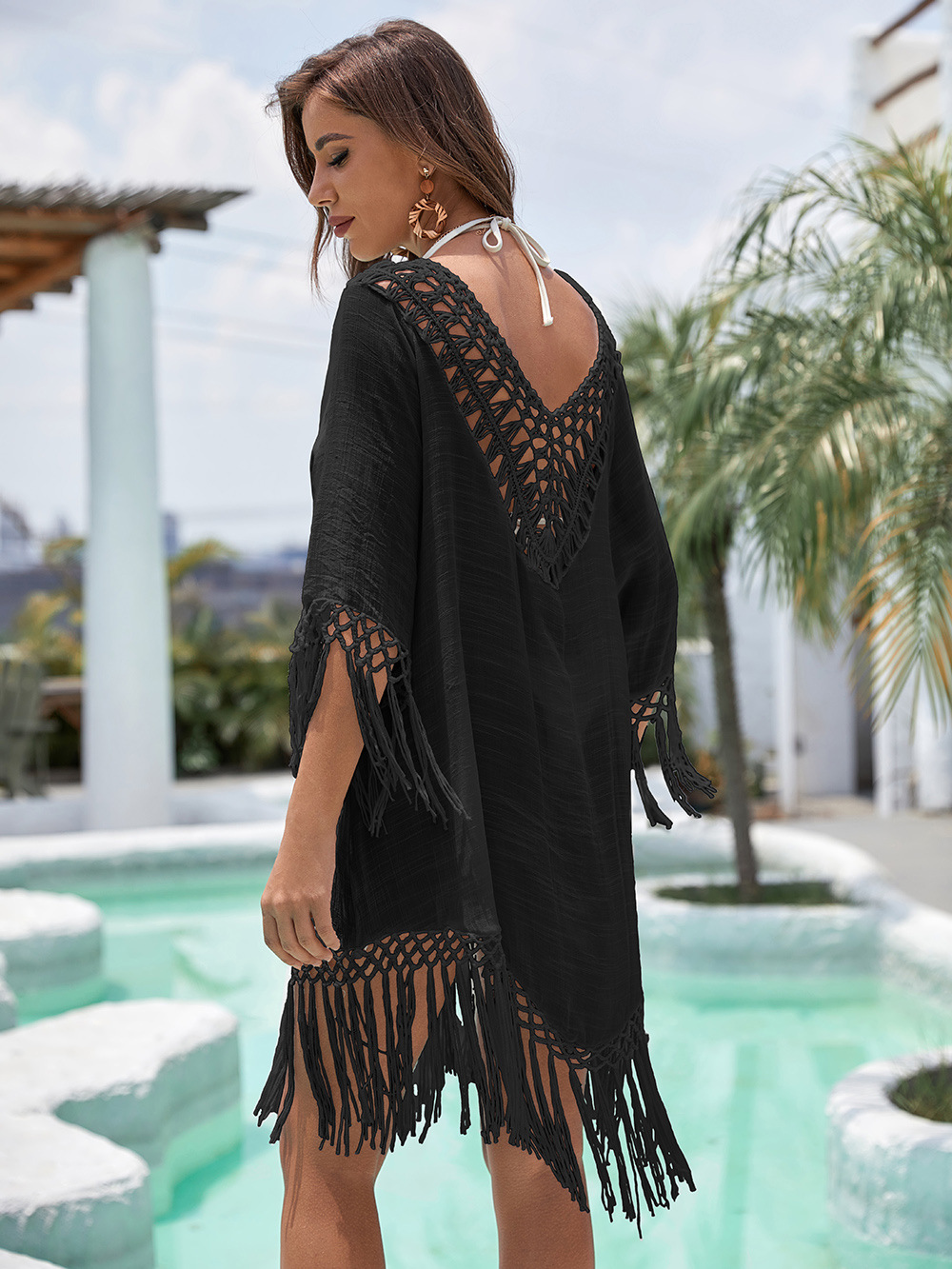 Hand Crocheting Stitching Tassel Solid Color Woven Hollow Out Cutout Sunscreen Bikini V neck Blouse Beach Dress