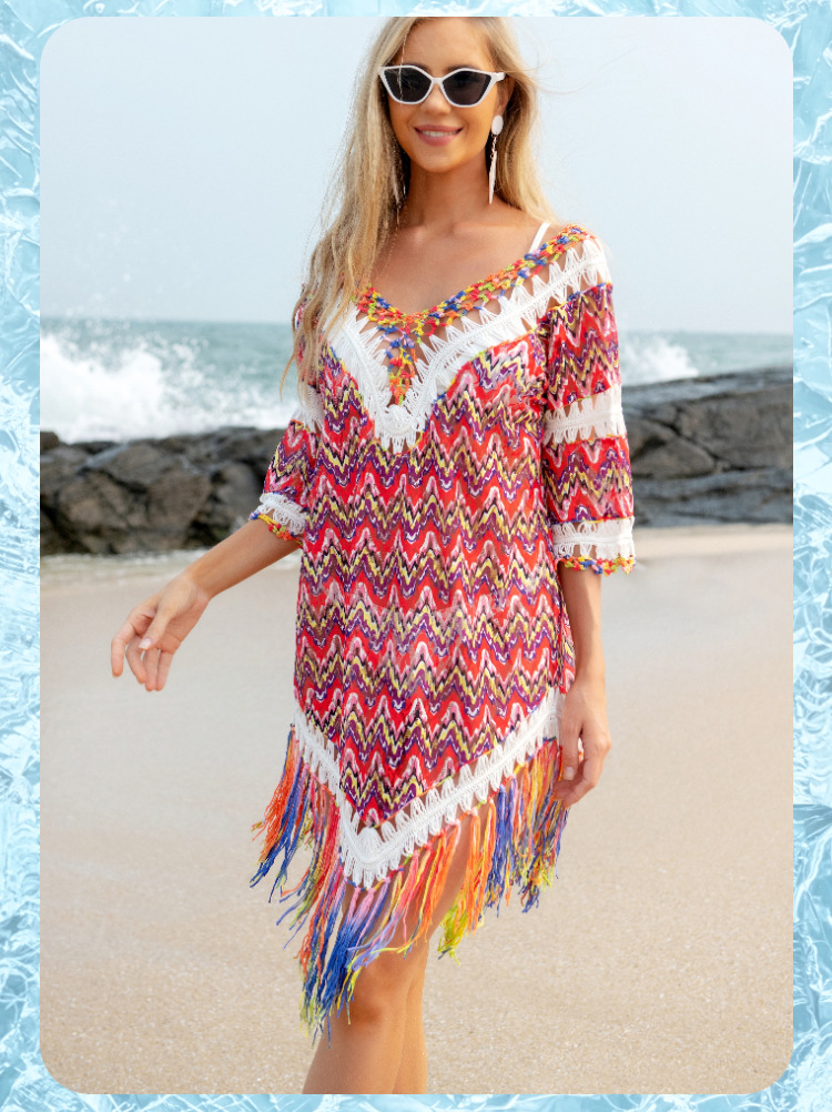 Hand Crocheting Wool Yarn Vacation Sexy Lace Beach Tassel Swimsuit Smock Dress