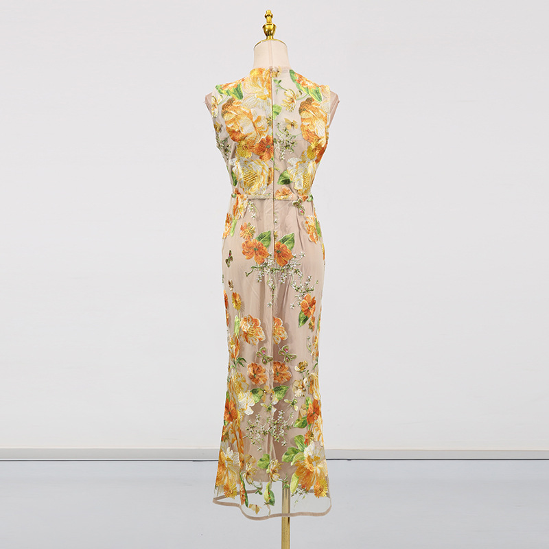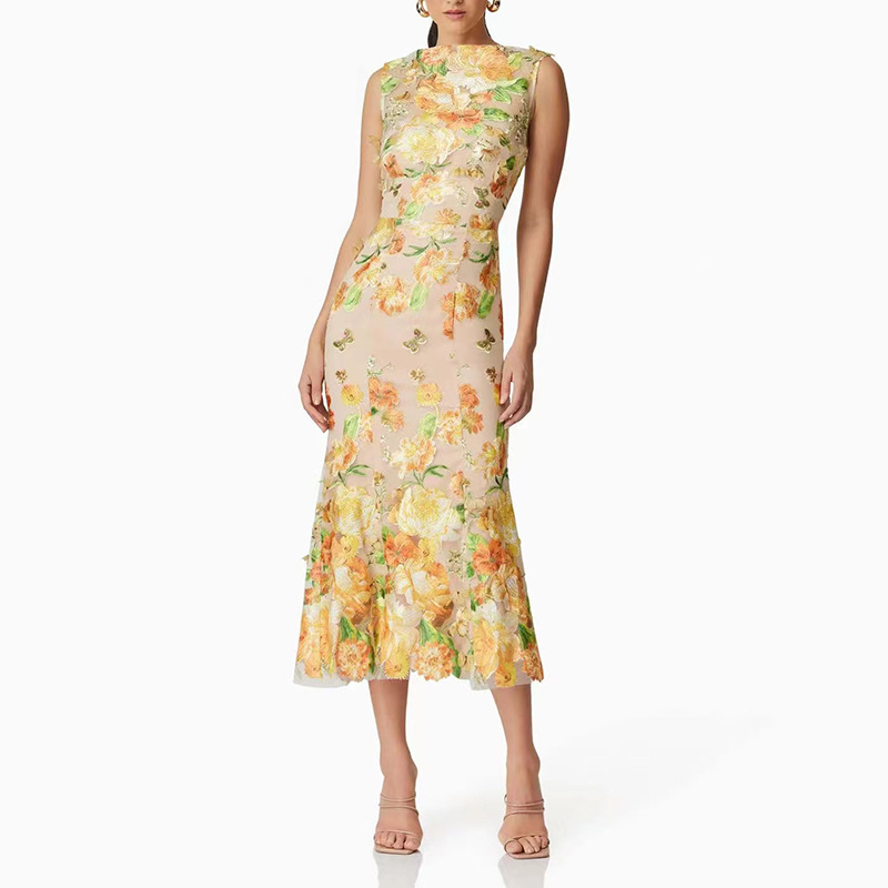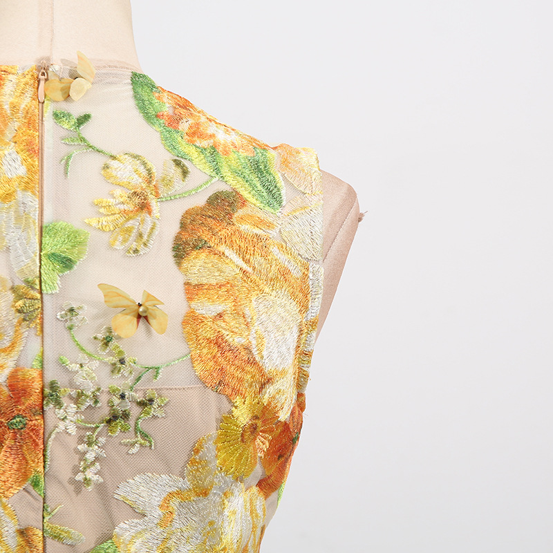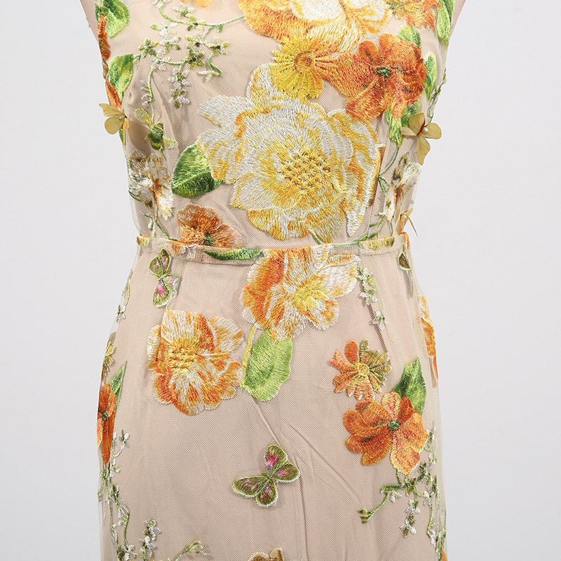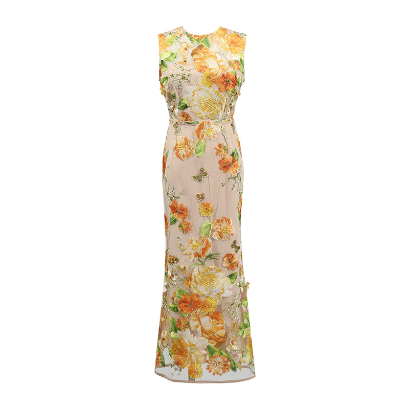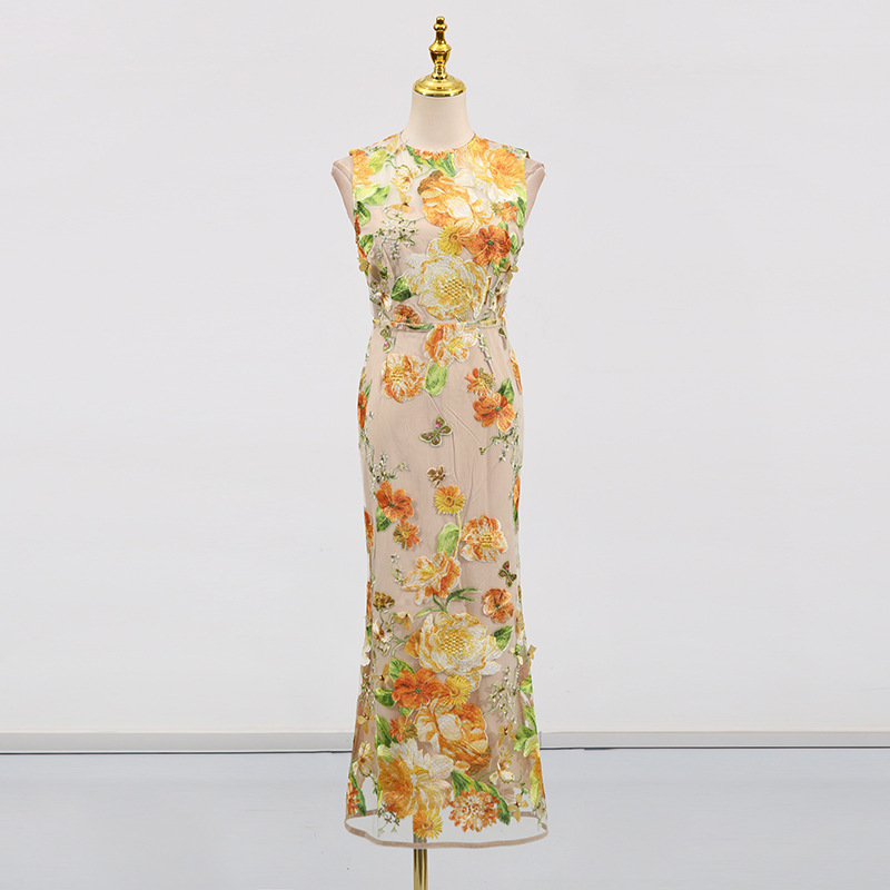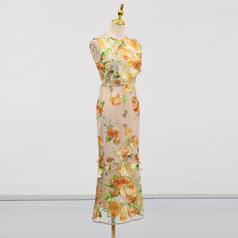 Heavy Industry High Sense Dress Color Embroidery Three Dimensional Floral Slim Fit Figure Flattering Maxi Dress