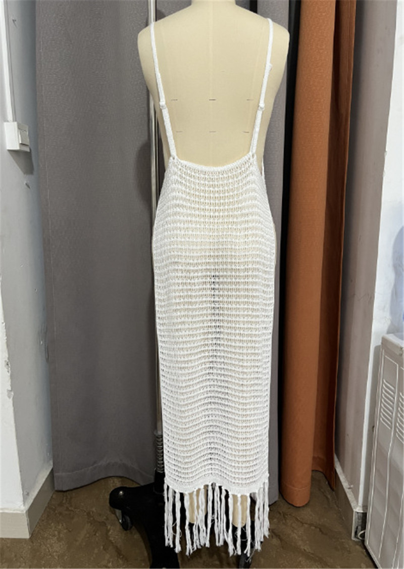 Knitted Backless Beach Cover up Sexy Tassel Hollow Out Holiday Sun Protection Shirt Beach Cover Up