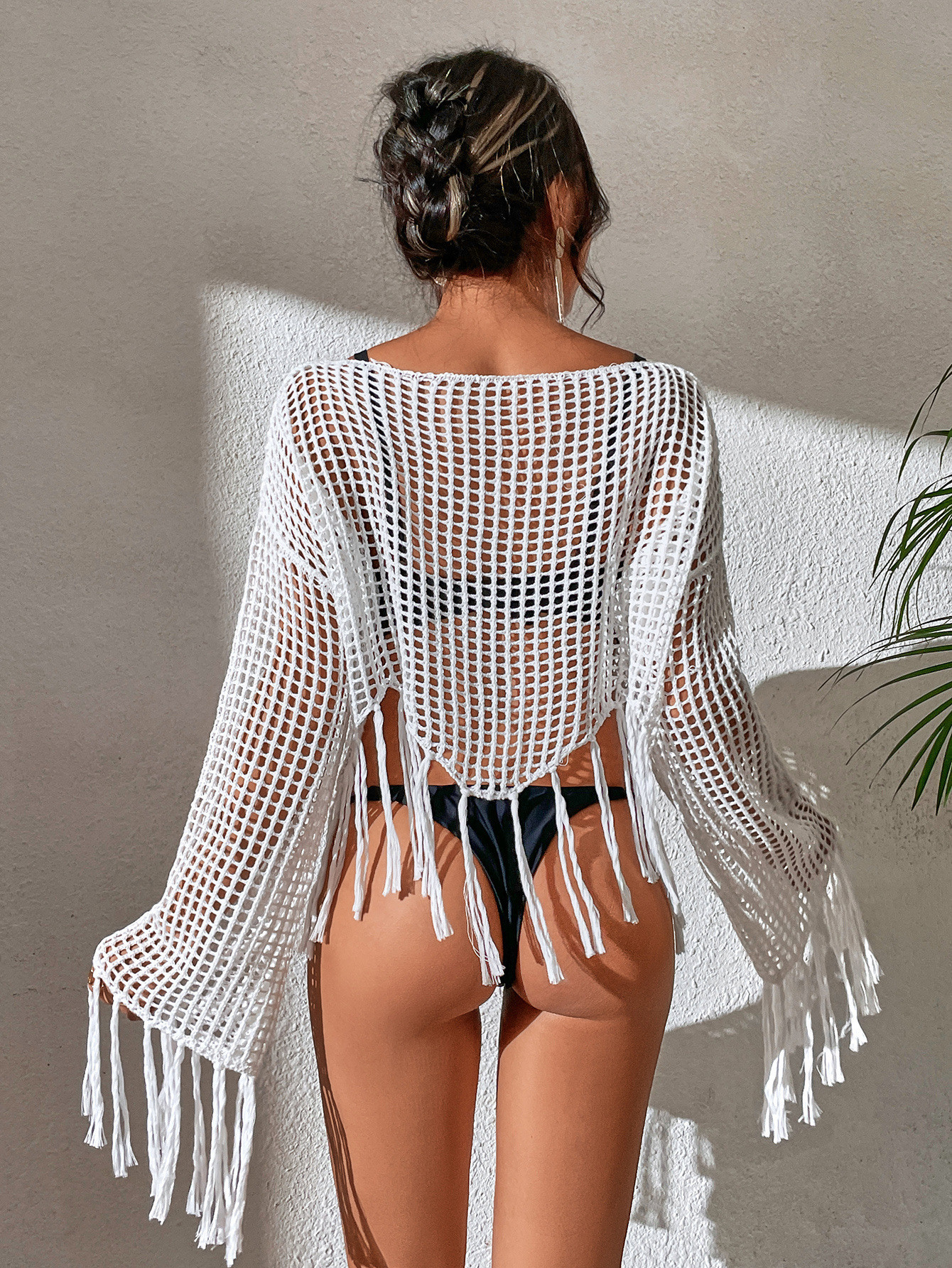 Knitted Tassel Beach Cover Up Sexy Cutout Vacation Skirt Swimsuit Sun Protection Shirt Beach Cover Up