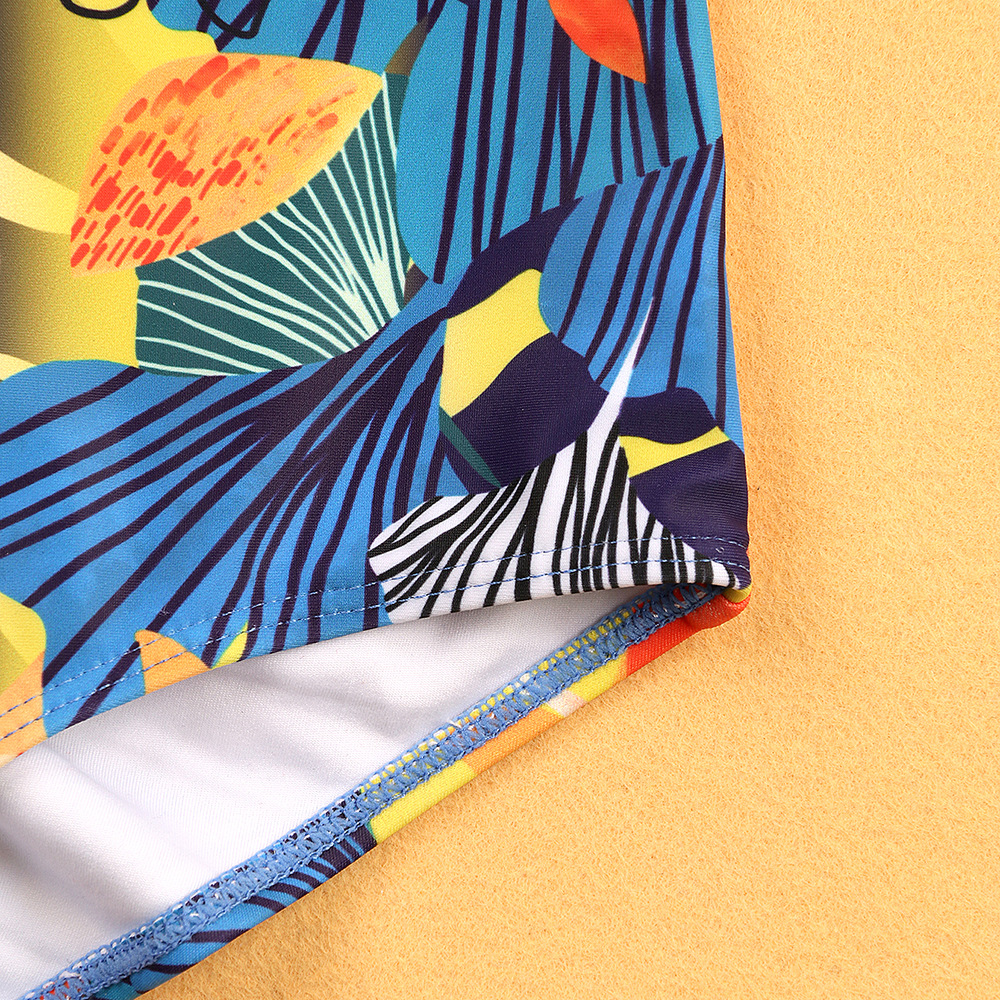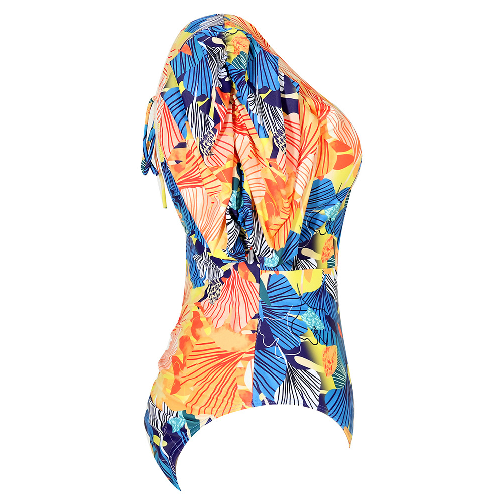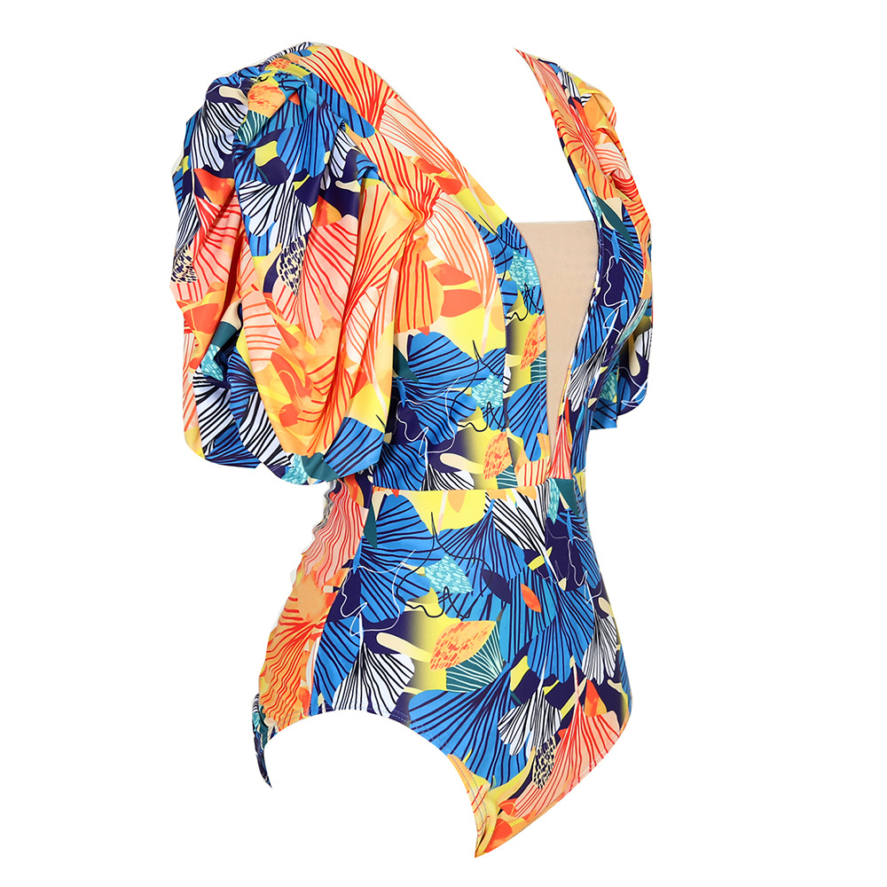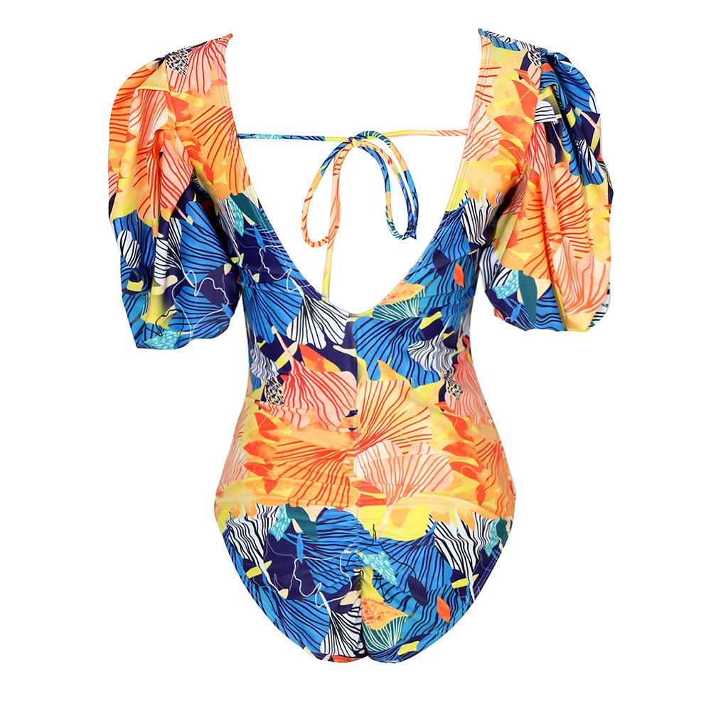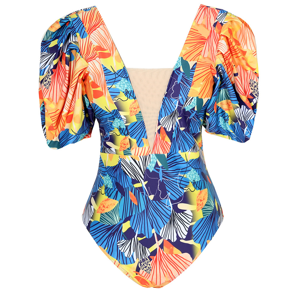 Puff Short Sleeve One Piece Swimsuit Women Printed Mesh Stitching Swimsuit