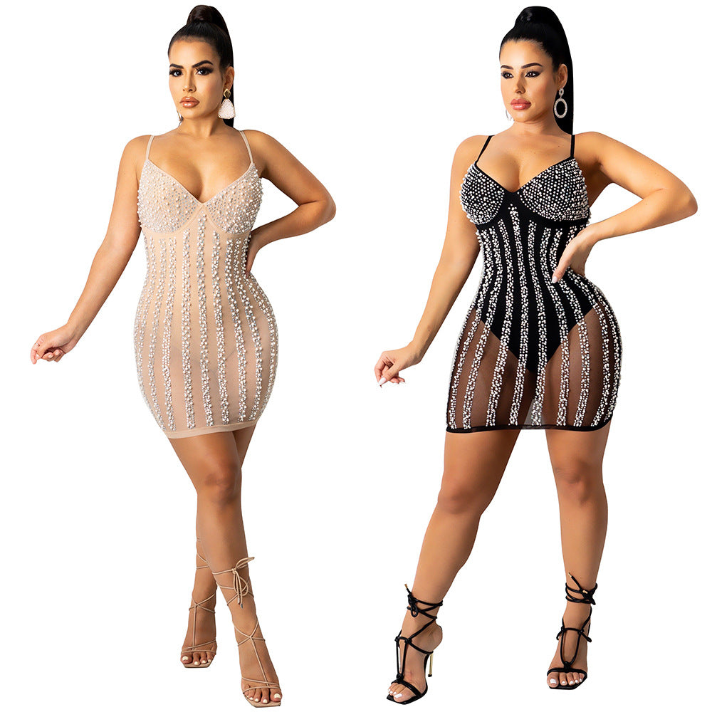Rhinestone Pearl See-through V-neck Brace Sexy Dress Nightclub Uniforms Plus size