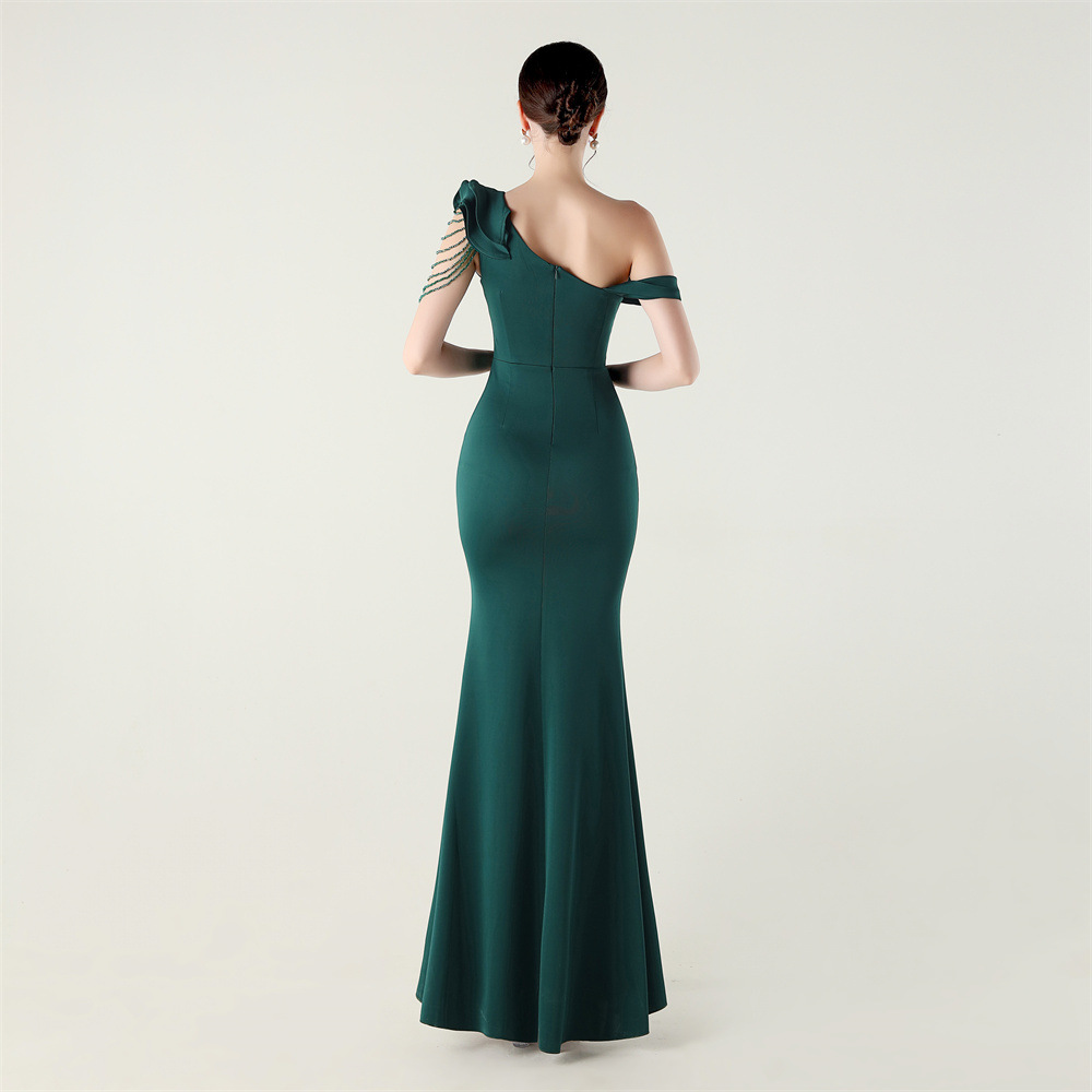 Ruffled One Shoulder Heavy Industry Beads String Slim Fit Satin Fishtail Evening Dress Wedding Red Carpet Cocktail Dress