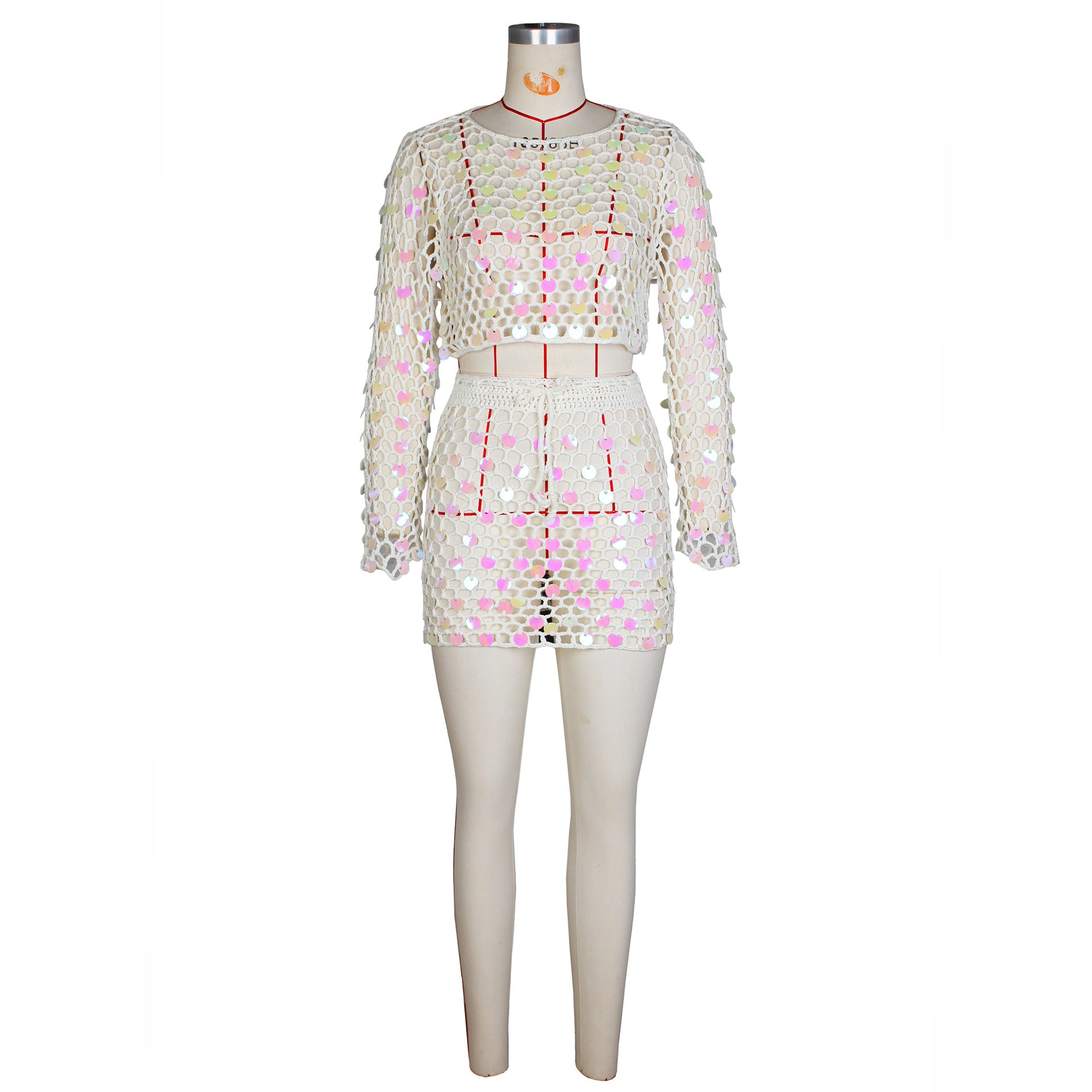 Sexy Women Handmade Crocheted Sequined Skirt Two Piece Beach Skirt Set