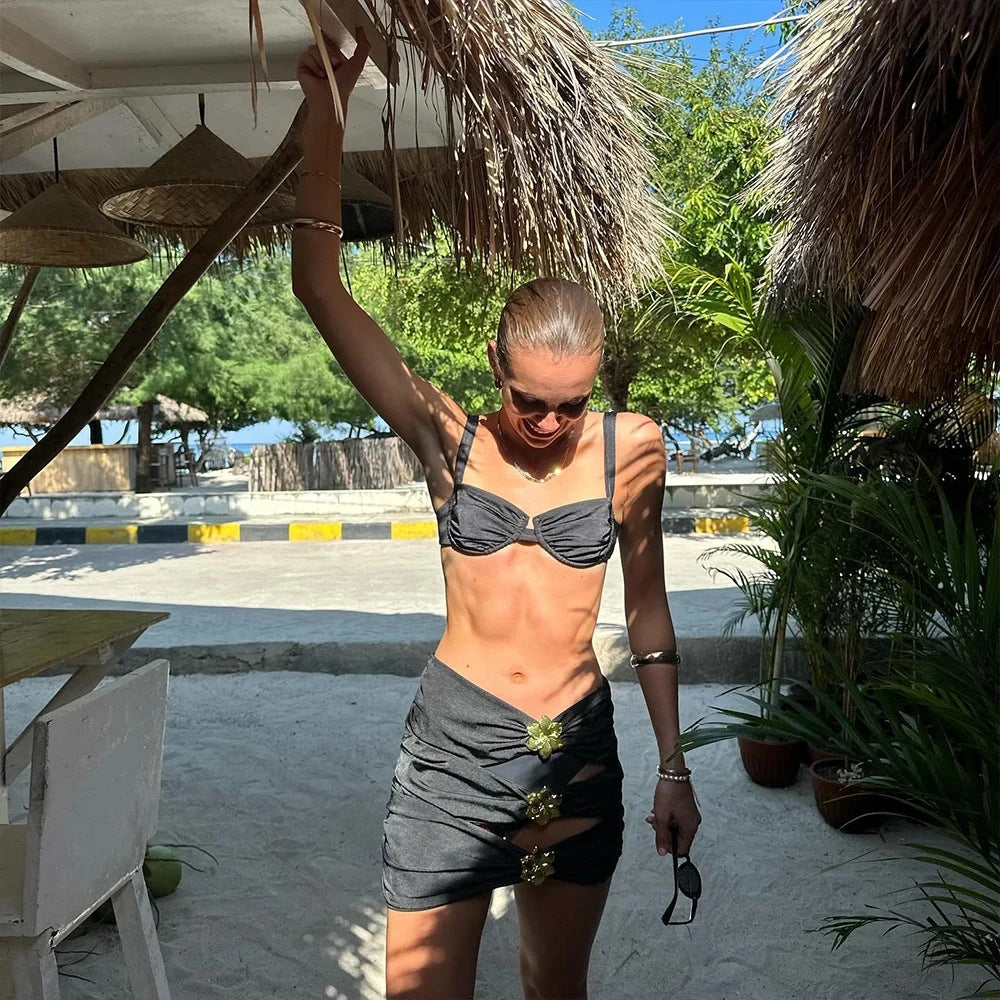 Short Skirt Three Piece Bikini Swimsuit Swimwear Solid Color Swimsuit for Women