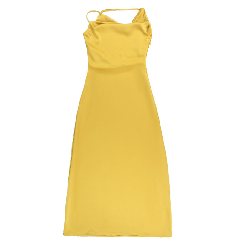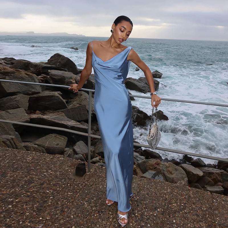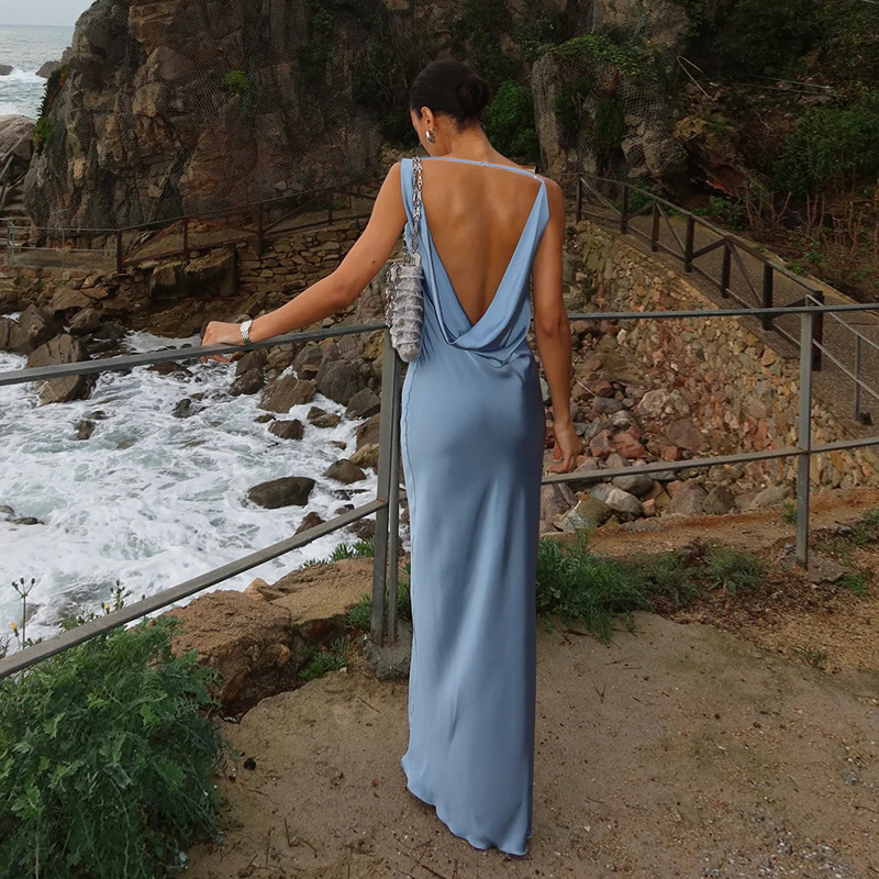 Sling Pockets Collar Sexy Backless Satin Formal Dress Elegant Evening Dress